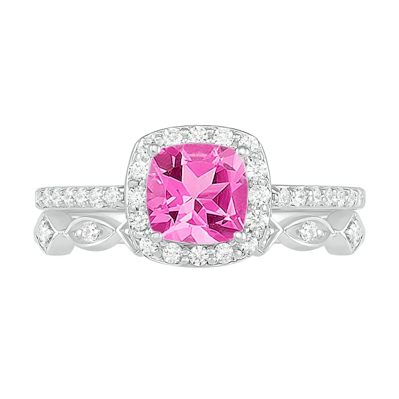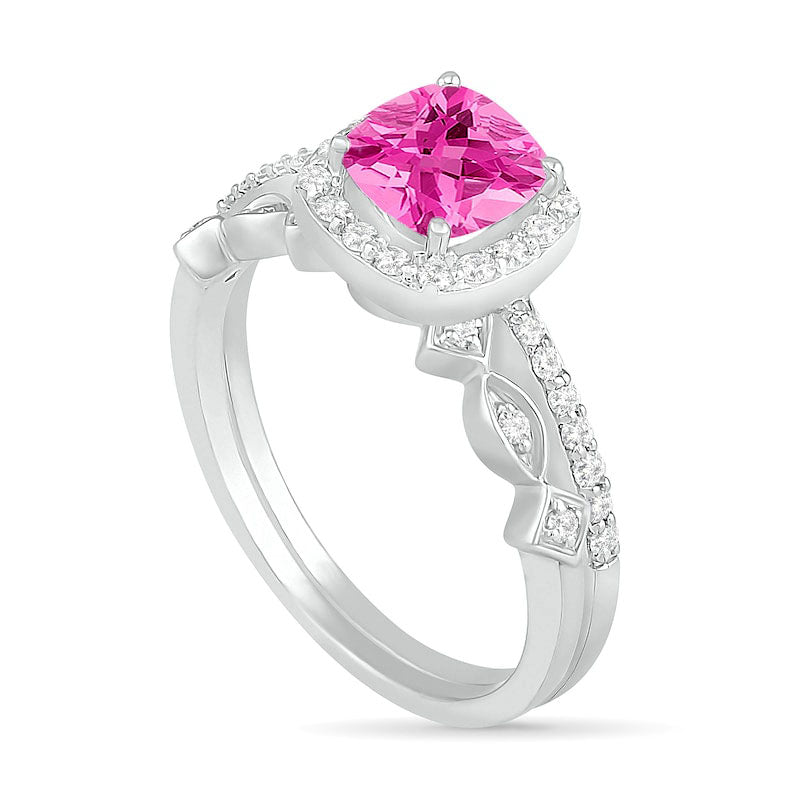 Capture the essence of your love with this exquisite gemstone and diamond bridal set. Fashioned in sleek 10K white gold, the stunning engagement ring boasts a 6.0mm cushion-cut lab-created pink sapphire nestled within a diamond-encrusted frame, set atop a slender band adorned with petite shimmering diamonds. For your special day, the coordinating band features art deco-inspired marquise and tilted-square shapes, each embellished with dazzling diamonds. Radiating with the brilliance of 1/4 ct. t.w. of diamonds and finished with a magnificent shine, this bridal set is a true testament to your love story.