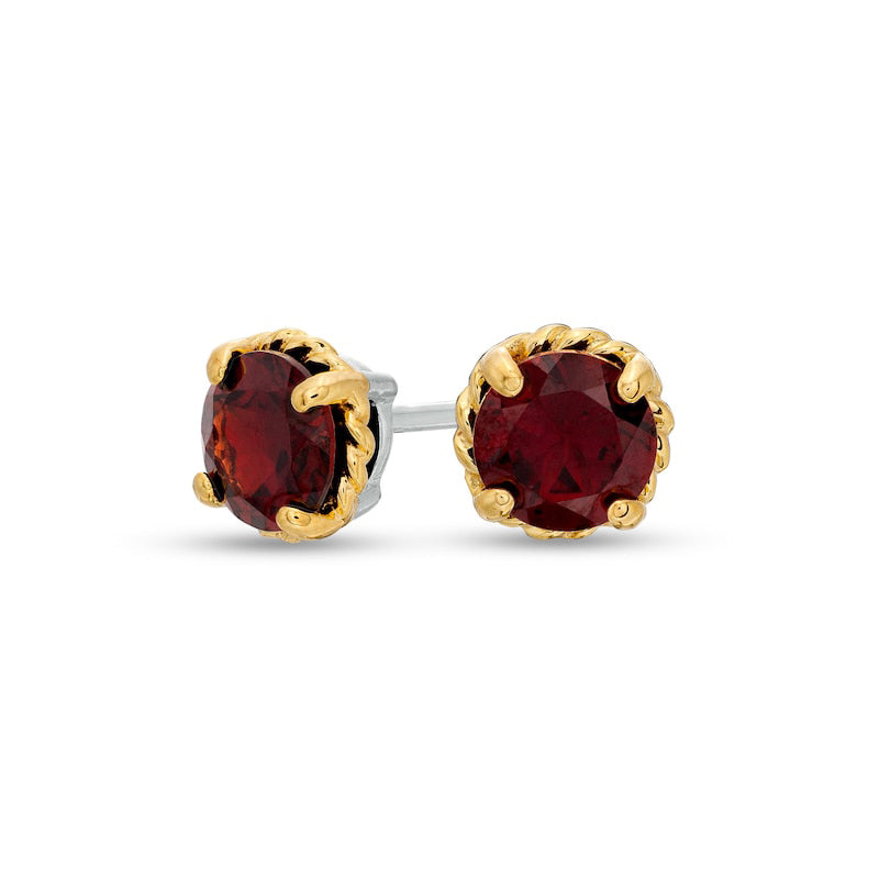 6.0mm Garnet Solitaire Rope-Textured Frame Stud Earrings in Sterling Silver and 10K Gold