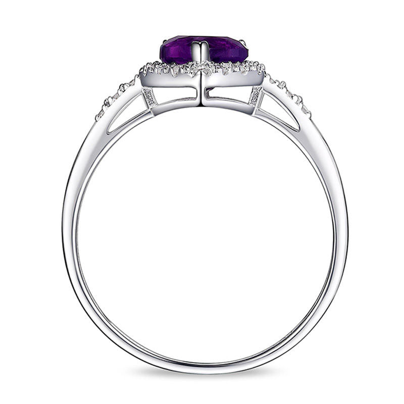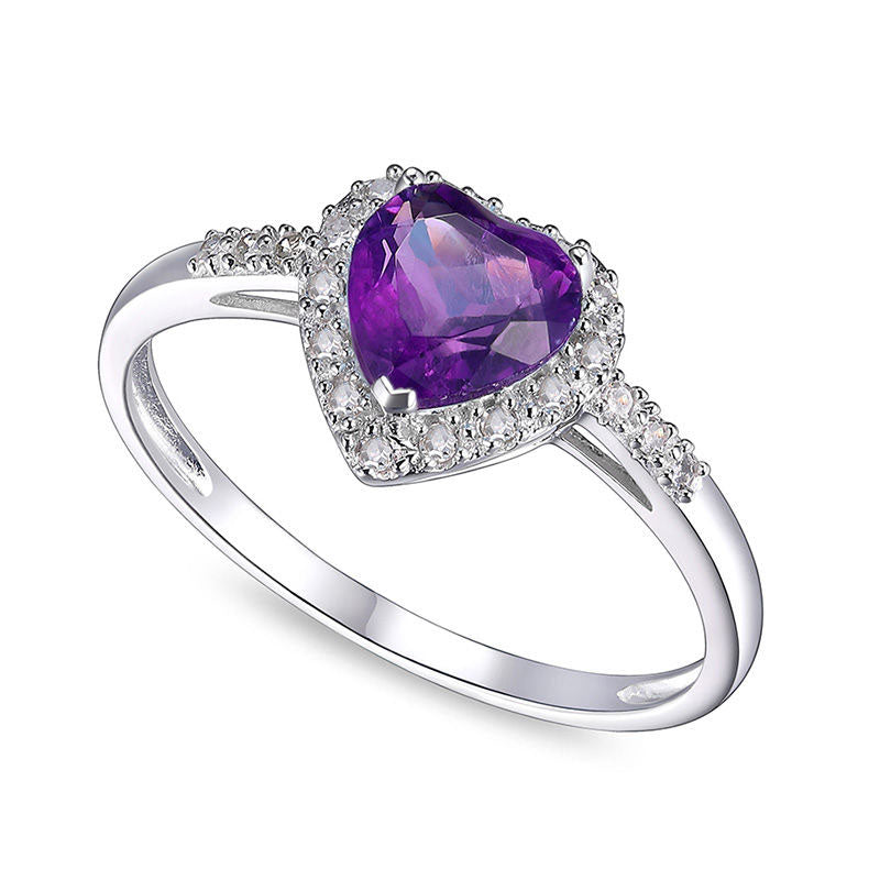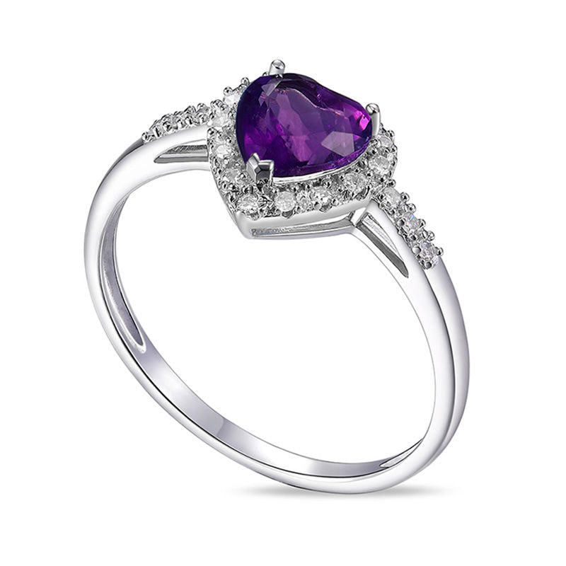 Adorn your finger with a stunning symbol of love with this exquisite 6.0mm Heart-Shaped Amethyst and 1/10 CT. T.W. Diamond Frame Ring in 10K White Gold. Luxuriously crafted in cool 10K white gold, this romantically designed ring boasts a beautiful heart-shaped bright purple amethyst encased in a dazzling frame of sparkling diamonds. The shank of the ring also features additional shimmering diamonds, adding to the overall glamour of this sweet and elegant design. With 1/10 ct. t.w. of diamonds and a radiant buffed luster, this is a ring that is certain to delight and captivate. Make any day extra special with this stunning gemstone and diamond heart ring.
