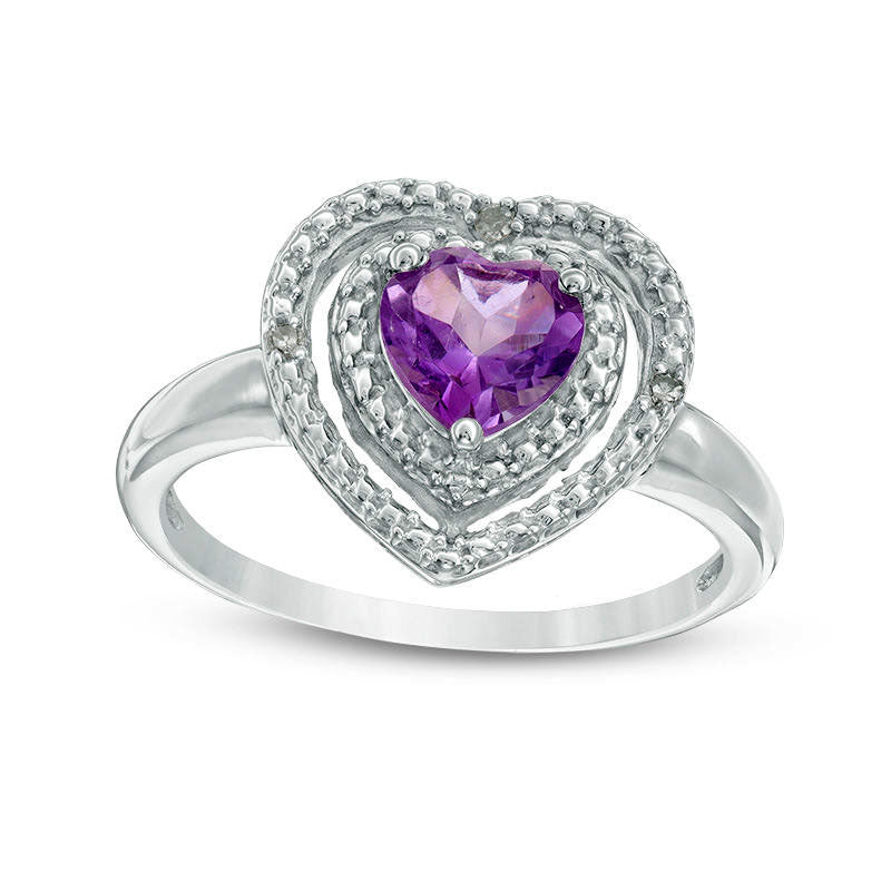 This charming ring is a true treasure that is sure to evoke feelings of romance. Expertly crafted from sterling silver, this delicate and feminine piece of jewelry features a stunning 6.0mm heart-shaped amethyst that boasts a striking, bright purple hue. Framed by a pair of open heart-shaped frames that are adorned with diamond accents and delicate beads, this ring offers an undeniably glamorous feel. With a brilliant luster and a custom fit to match her ring size, this lovely ring is simply divine. Please note that sterling silver rings cannot be resized after purchase.