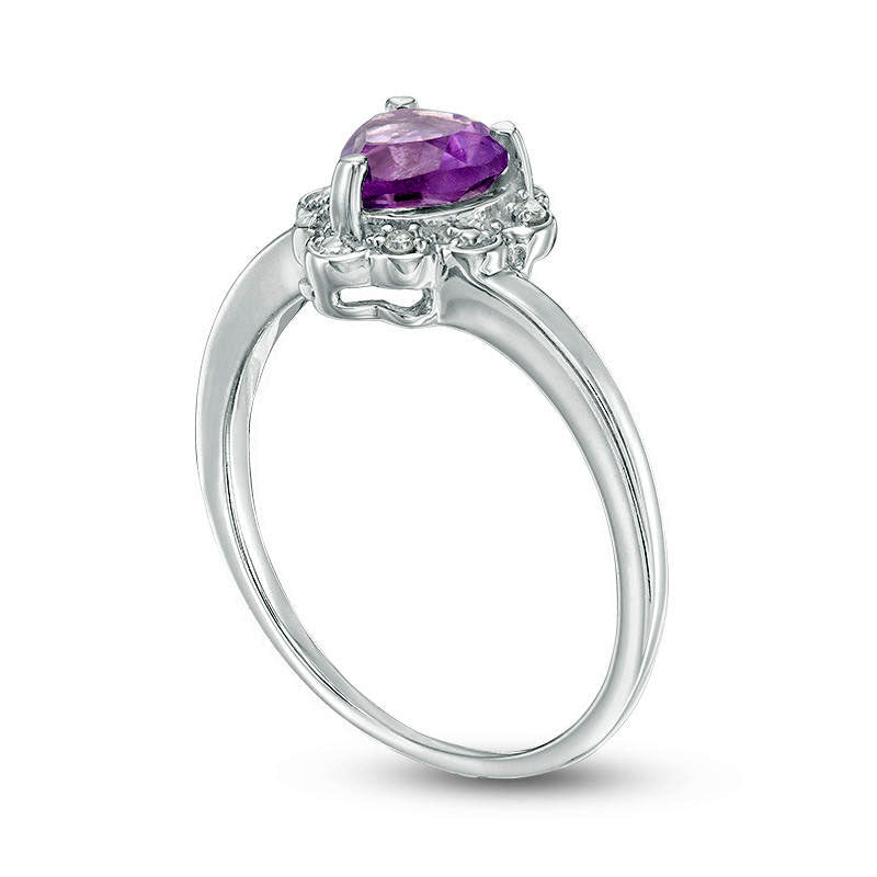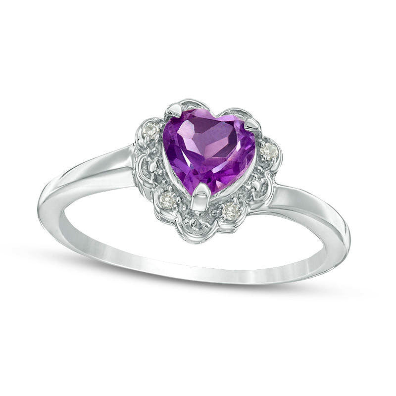 Express your love with this charming and dainty gemstone ring. Made of high-quality sterling silver, the ring showcases a vivid, heart-shaped amethyst that measures 6.0mm in the center. The amethyst is beautifully framed with scalloped edges, adding to the ring's romantic appeal. The addition of petite diamond accents provides a subtle yet stunning touch of sparkle. The ring's off-set shank perfectly complements the design, making it a truly special piece of jewelry that any woman will treasure. Custom-made to fit her ring size, this delightful keepsake will appeal to her feminine side and is sure to become a cherished possession. Please note that sterling silver rings cannot be resized after purchase.