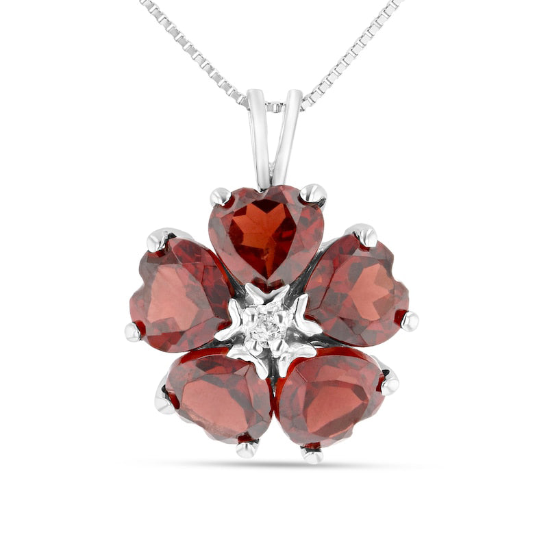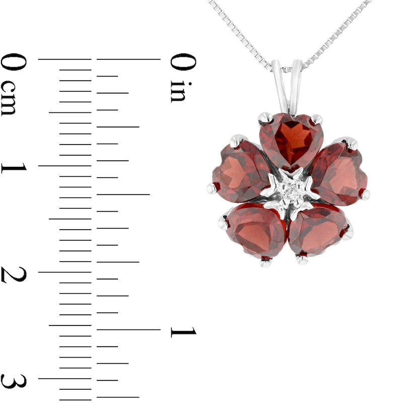 6.0mm Heart-Shaped Garnet and Natural Diamond Accent Flower Pendant in 14K White Gold