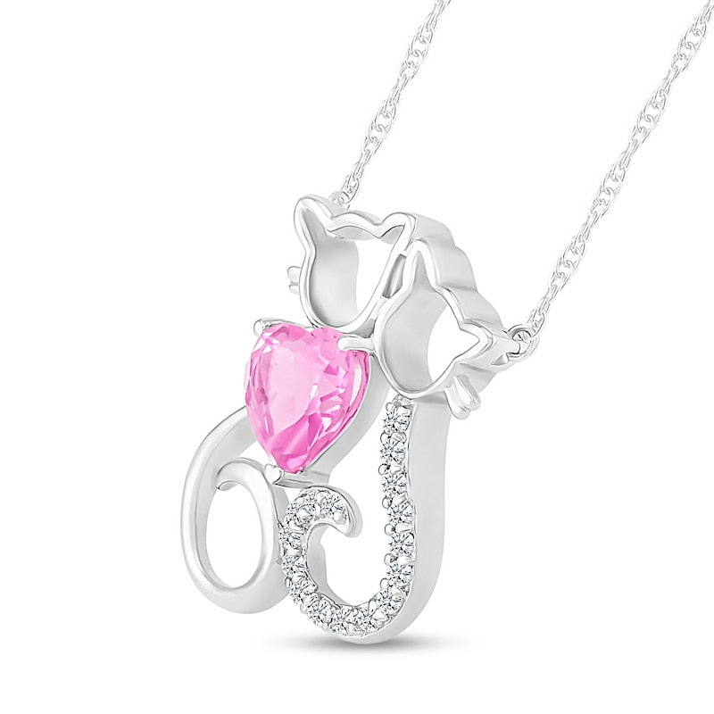 6.0mm Heart-Shaped Pink and White Lab-Created Sapphire Motherly Love Cat and Kitten Necklace in Sterling Silver