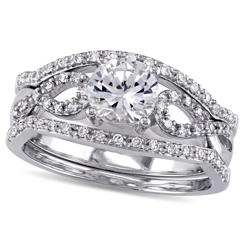 6.0mm Lab-Created White Sapphire and 0.20 CT. T.W. Diamond Loop Three Piece Bridal Engagement Ring Set in Solid 10K White Gold
