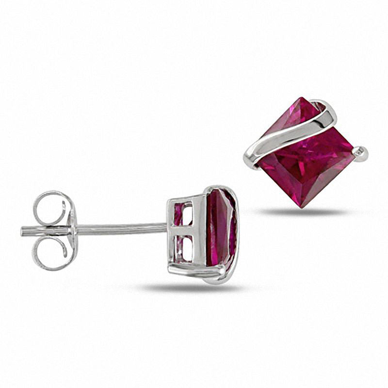 6.0mm Princess-Cut Lab-Created Ruby Swirl Stud Earrings in 10K White Gold
