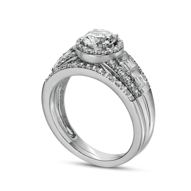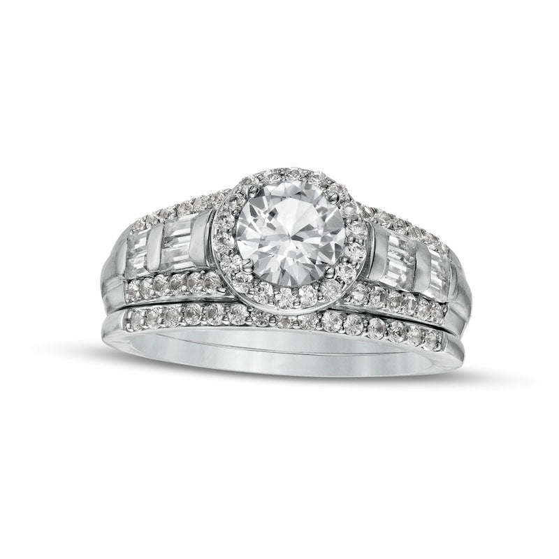 Celebrate your love with this stunning White Lab-Created Sapphire Bridal Set. Expertly crafted in sterling silver, the engagement ring showcases a 6.0mm white lab-created sapphire at its center, encircled by a delicate frame of lab-created sapphires. The multi-row shank is adorned with alternating pairs of baguette-cut and round lab-created sapphires, each set within a border of sparkling lab-created accents. Completing the set is a coordinating band, also embellished with lab-created sapphires. With its bright, polished finish, this bridal set is the perfect symbol of your lifetime commitment.