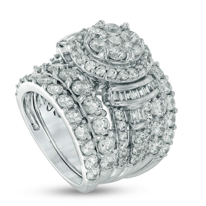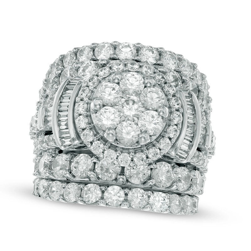 6 CT. T.W. Composite Natural Diamond Frame Collared Three Piece Bridal Engagement Ring Set in Solid 14K White Gold