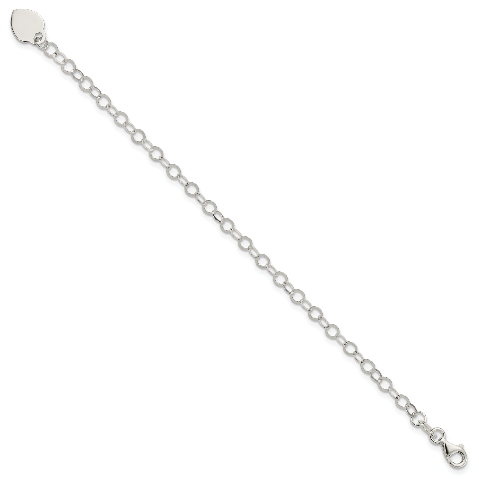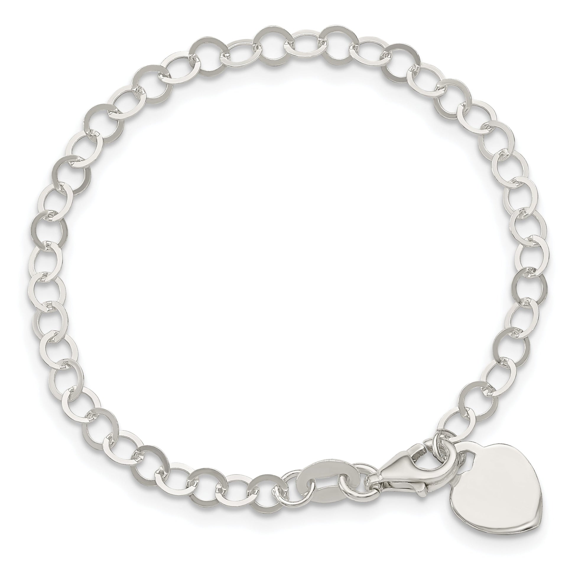 The 6 Inch Sterling Silver Engravable Heart Charm Child's Bracelet is a charming piece designed for young ones. Crafted from 925 sterling silver, this bracelet boasts a shiny, polished finish that gives it a radiant and timeless appearance. Measuring 6 inches in length, it's an ideal fit for most children. The heart charm, which can be engraved, adds a personal touch that makes it extra special. Equipped with a fancy lobster clasp, it's both secure and easy to wear. With its classic flat back profile and solid construction, this bracelet is a lovely gift for any occasion.