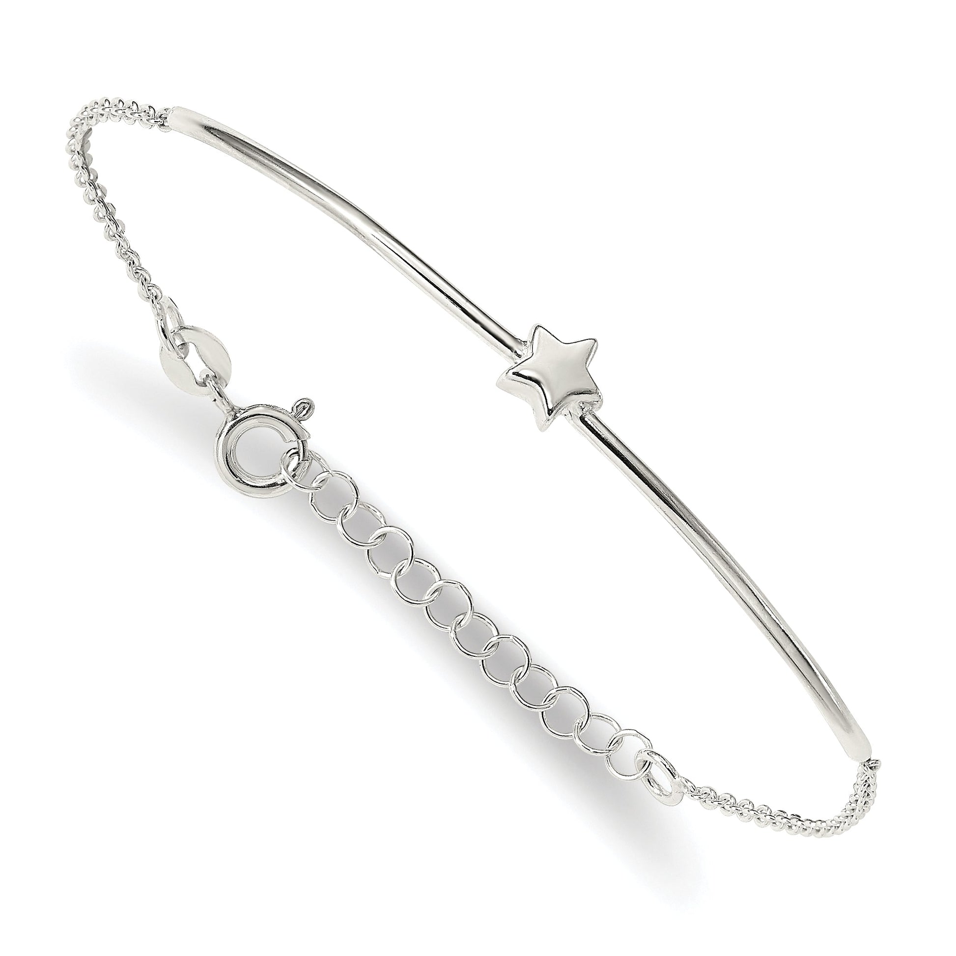 The 6 Inch Sterling Silver Stars Bangle and Bracelet with 1-Inch Extender is a timeless piece of elegance. Crafted from high-quality 925 sterling silver, this polished two-piece set offers a refined look suitable for any occasion. The bracelet features a delicate cable chain spanning 6 inches, while charming star elements accentuate its grace. Each star measures 6.3 mm in length and 6.1 mm in width, adding a touch of celestial beauty. A spring ring clasp provides security while enhancing its sleek design. Ideal for women who appreciate understated charm and strength, this sterling silver set makes a thoughtful gift or personal treasure.