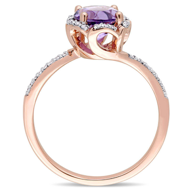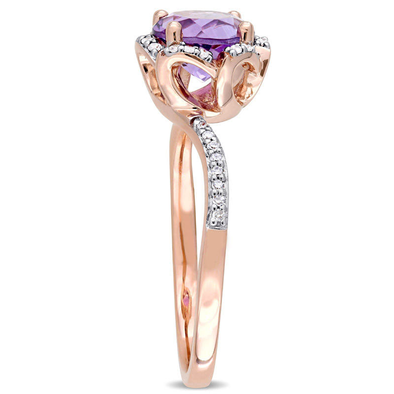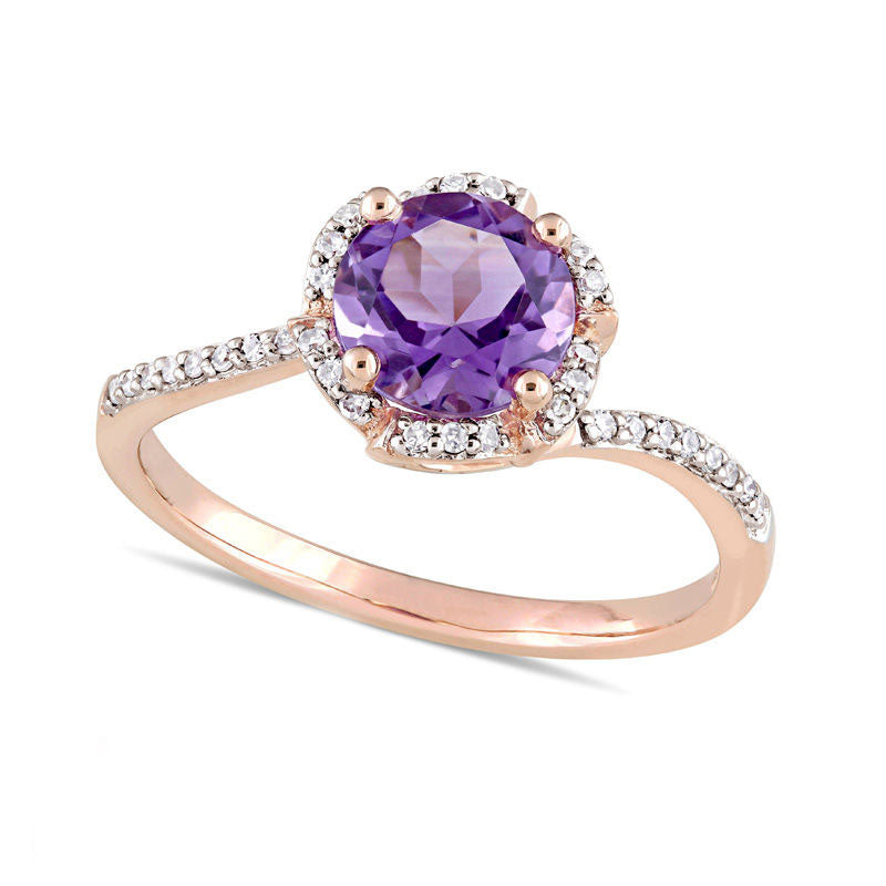 This 14K rose gold ring is designed to make any occasion special. The focal point of this elegant piece is a vibrant 7.0mm amethyst surrounded by a flower-like scalloped frame, embellished with sparkling diamonds. The slender bypassing ribbons of the shank are also adorned with petite diamonds, adding a touch of shimmer to the already enchanting design. With a total diamond weight of 1/10 ct. t.w. and a radiant buffed luster, this ring exudes both beauty and style, making it a perfect accessory for any outfit or event.