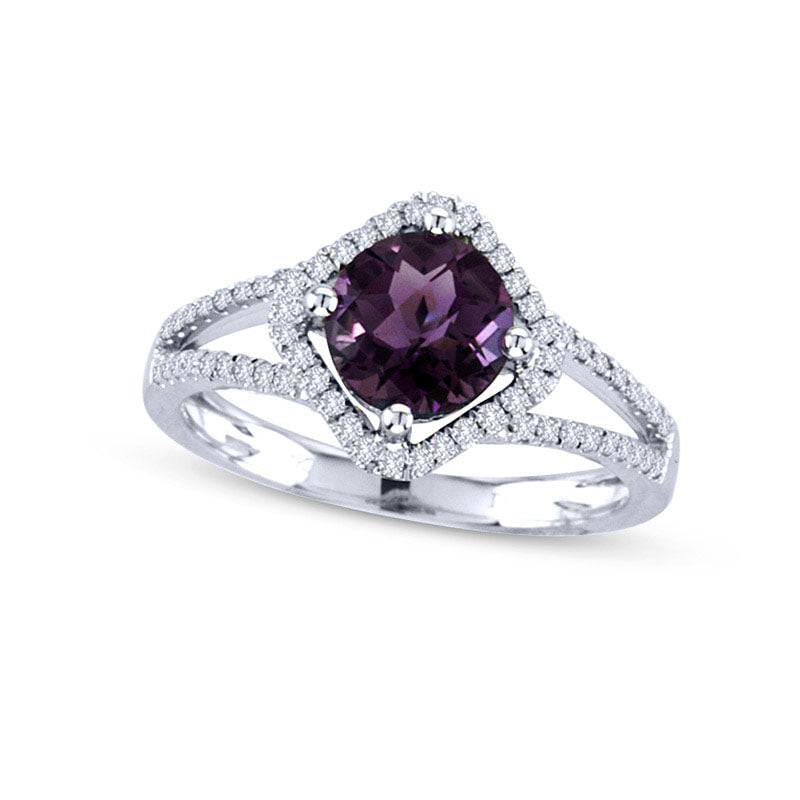 This stunning gemstone and diamond ring exudes modern elegance and sophistication. Crafted with high-quality 14K white gold, the focal point of the piece is the breathtaking 7.0mm amethyst center stone that boasts a brilliant purple hue. The center stone is surrounded by a kite-shaped halo frame embellished with sparkling diamonds, and the split shank is also adorned with additional diamonds. With a total weight of 1/4 ct., the diamonds truly enhance the ring's beauty and sparkle. This exquisite ring is sure to become a cherished piece, catching attention with its stunning design and gleaming shine.