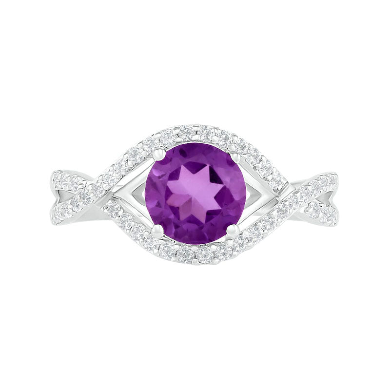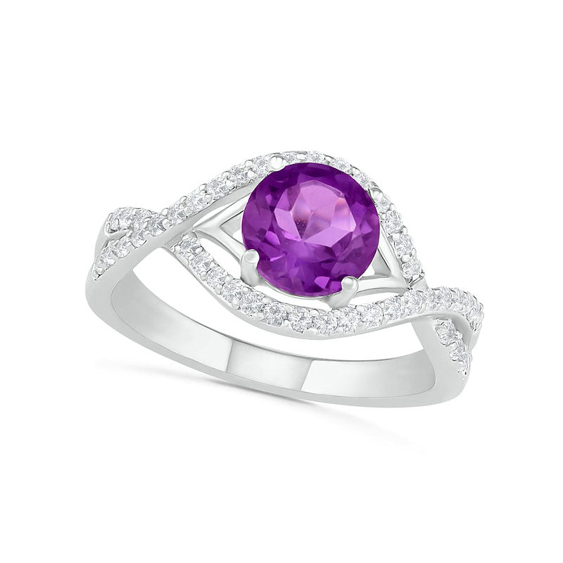7.0mm Amethyst and White Lab-Created Sapphire Frame Evil Eye Twist Shank Ring in Sterling Silver