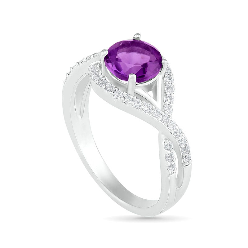 The "7.0mm Amethyst and White Lab-Created Sapphire Frame Evil Eye Twist Shank Ring in Sterling Silver" is a captivating piece of jewelry that will elevate any outfit. Made from high-quality sterling silver, this ring features a stunning 7.0mm amethyst gemstone at the center, complemented by sleek "V"-shaped accents. Surrounding the amethyst are white lab-created sapphire stones arranged in a bypass design, together creating an evil eye-inspired look. The split shank of the ring is beautifully twisted, with more white sapphires glimmering along its curves. Polished to a brilliant luster, this ring is a mesmerizing addition to your collection that can be worn for any occasion.