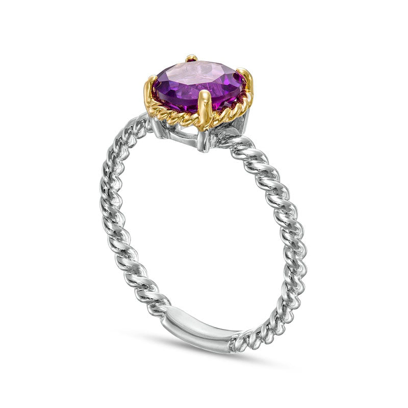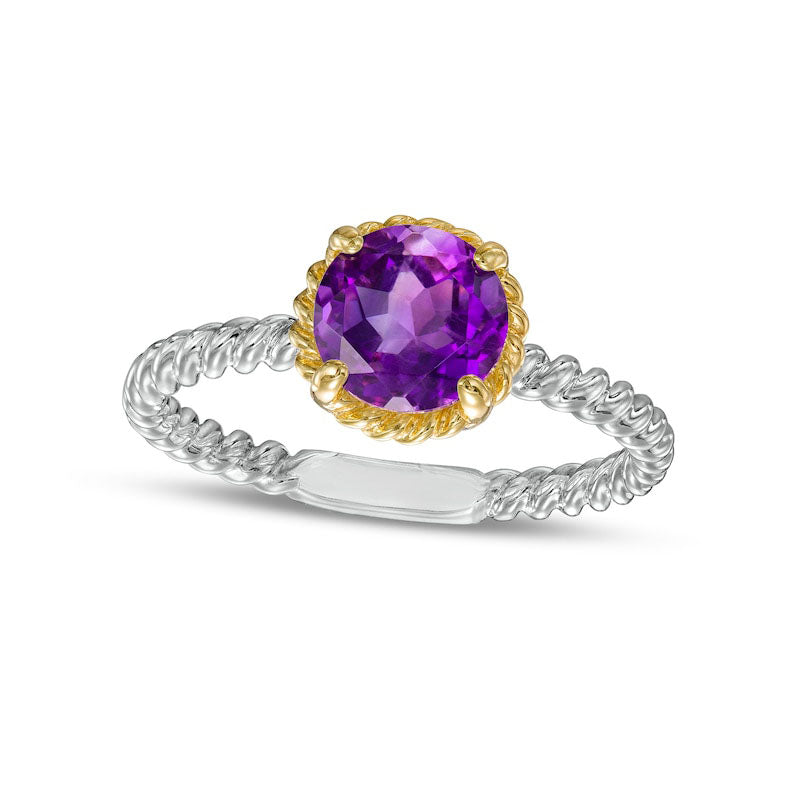 7.0mm Amethyst Solitaire Rope-Textured Frame and Shank Ring in Sterling Silver and Solid 10K Yellow Gold
