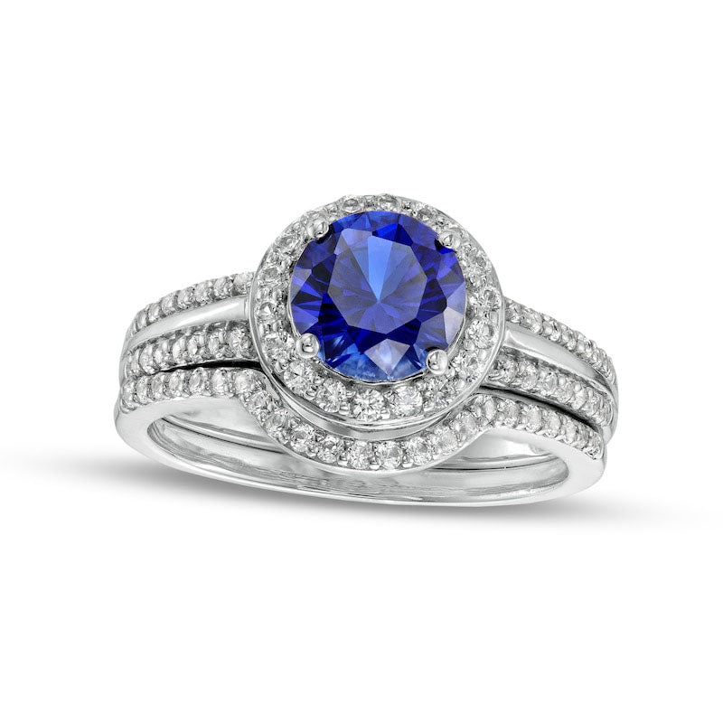 7.0mm Blue and White Lab-Created Sapphire Frame Triple Row Bridal Engagement Ring Set in Sterling Silver