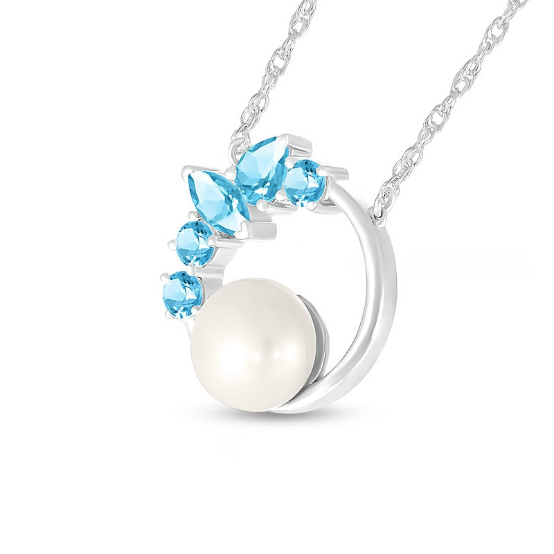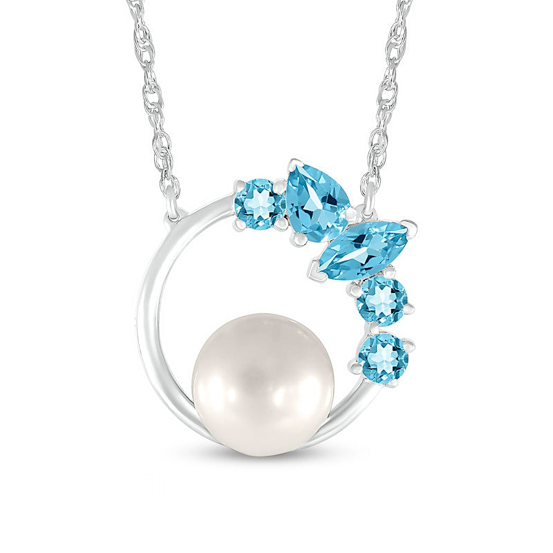 7.0mm Cultured Freshwater Pearl and Multi-Shaped Swiss Blue Topaz Scatter Open Circle Necklace in Sterling Silver