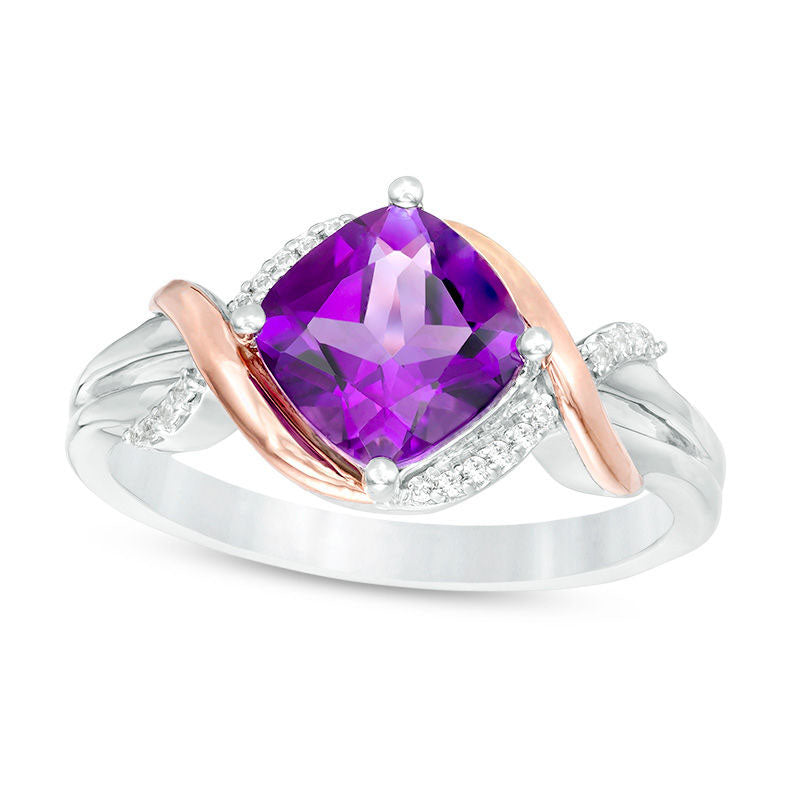 7.0mm Cushion-Cut Amethyst and 0.040.04 CT. T.W. Natural Diamond Overlay Frame Ring in Sterling Silver and Solid 10K Rose Gold