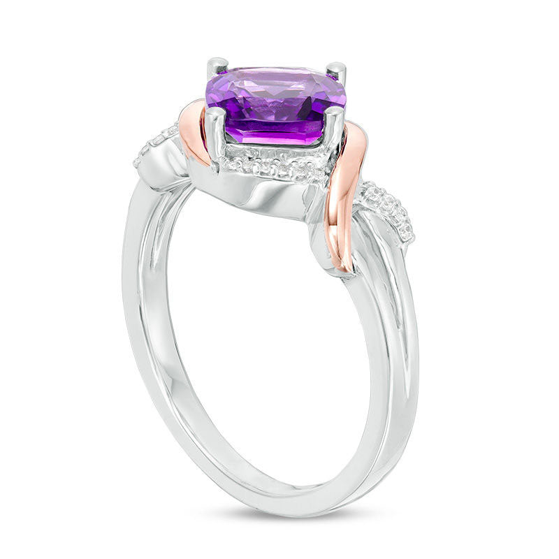 This exquisite ring is sure to leave her in awe. Crafted from sterling silver and 10K rose gold, it features a stunning 7.0mm cushion-cut amethyst that sparkles in a vibrant shade of purple. The amethyst is surrounded by a delicate frame of swirling rose gold and sparkling silver ribbons adorned with 1/20 ct. t.w. of diamonds. This design exudes a radiant beauty that is perfect for any occasion. Please note that custom-made sizing is available, but sterling silver rings cannot be resized after purchase.