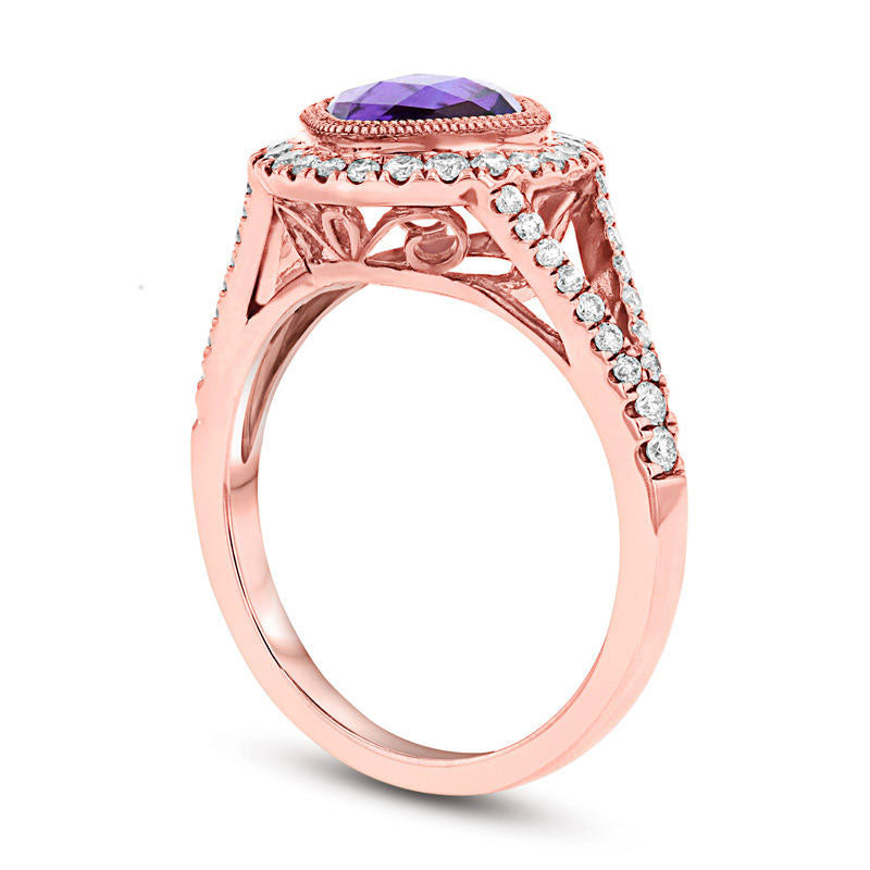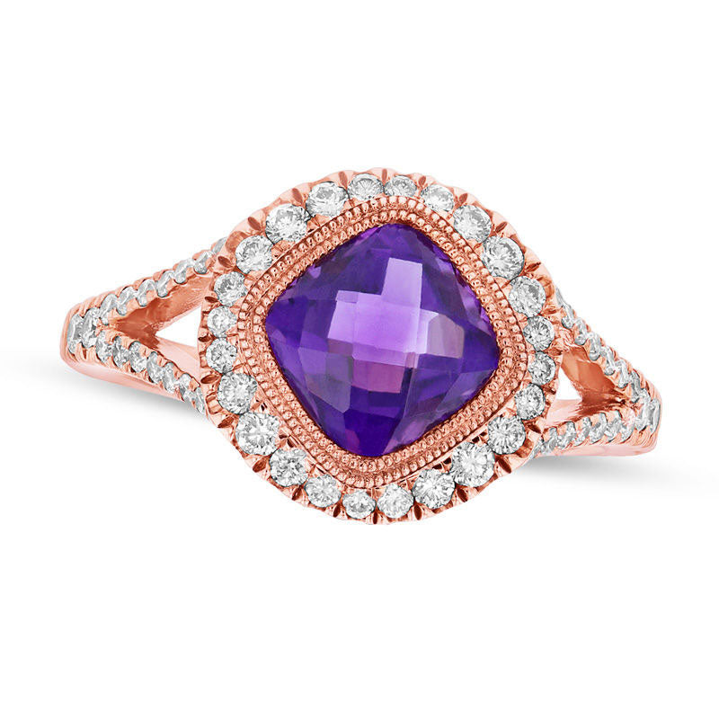 7.0mm Cushion-Cut Amethyst and 0.38 CT. T.W. Natural Diamond Frame Split Shank Ring in Solid 14K Rose Gold