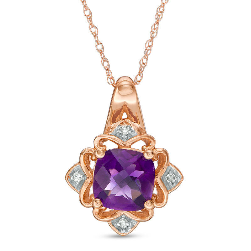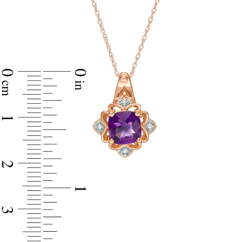 7.0mm Cushion-Cut Amethyst and Natural Diamond Accent Art Deco Pendant in 10K Rose Gold
