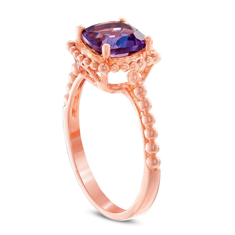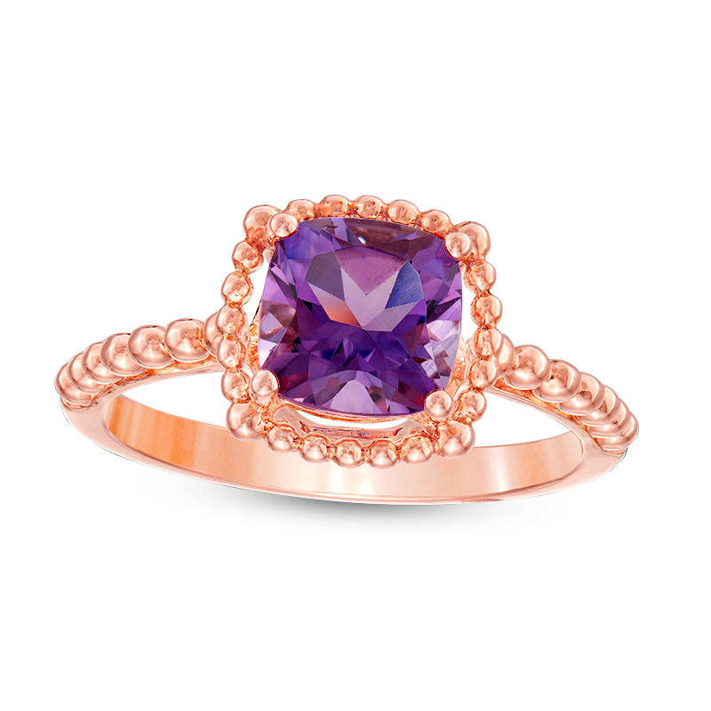 Add a pop of color to any outfit with this stunning gemstone ring. Crafted in 10K rose gold, the ring features a dazzling 7.0mm cushion-cut amethyst in a bright purple hue, set within a charming beaded frame. The slender shank of the ring is adorned with larger polished beading on either side, adding an ultra-feminine touch to its overall design. Buffed to a brilliant luster, this sassy and stylish ring is a must-have accessory. Available only in size 7, it is the perfect addition to any jewelry collection.