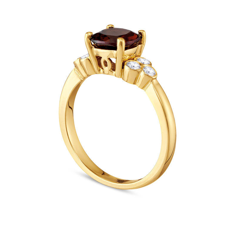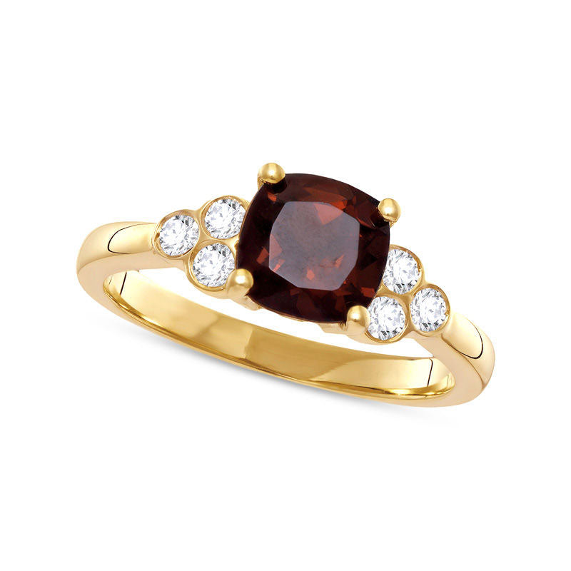 Entice her with this exquisite gemstone and diamond ring. Made from lustrous 10K gold, this stunning piece showcases a 7.0mm cushion-cut garnet of striking regal red, accompanied by trios of glittering bezel-set diamonds. With an impressive weight of 1/5 ct. t.w. of diamonds and a brilliant polished finish, this ring, which features the January birthstone, will create an unforgettable moment.