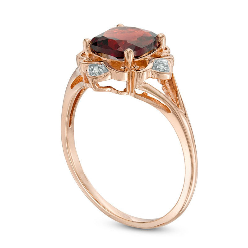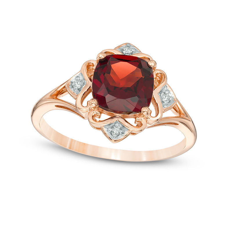 Treat the January-born lady in your life to a stunning gemstone piece with this elegant ring. Beautifully made with luxurious 10K rose gold, it boasts a four-square design that showcases a gorgeous 7.0mm cushion-cut garnet in a regal red hue. The centerpiece is accented by a polished swirl frame and twinkling diamond accents, exuding a truly majestic charm. With a split-shank style and a lustrous finish, this ring is an ideal choice for any occasion. Surprise her with this exceptional piece and watch her eyes light up with delight.