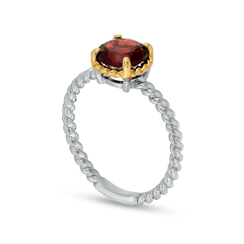 7.0mm Garnet Solitaire Rope-Textured Frame and Shank Ring in Sterling Silver and Solid 10K Yellow Gold