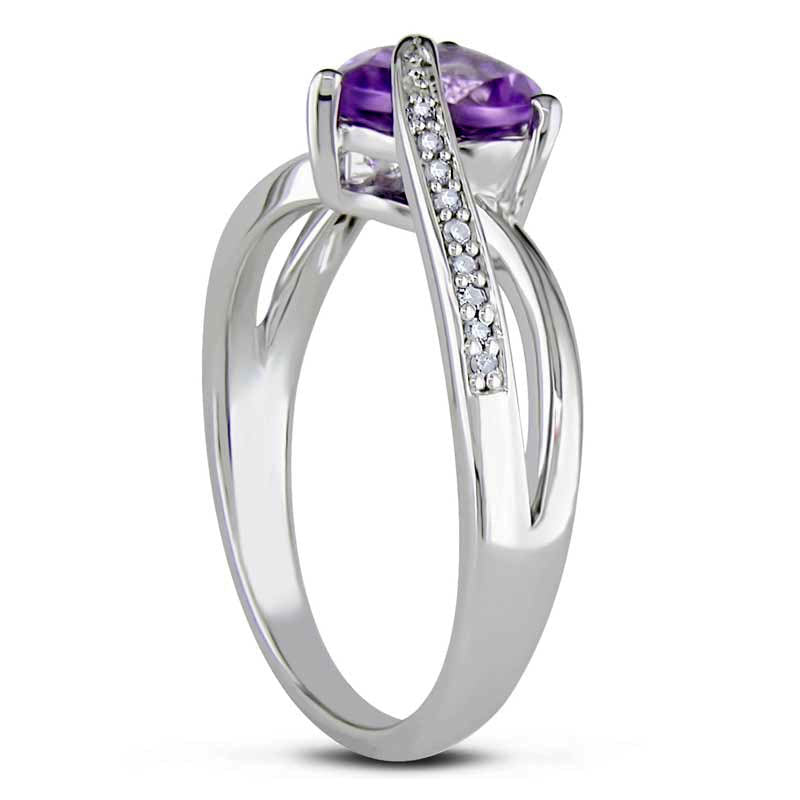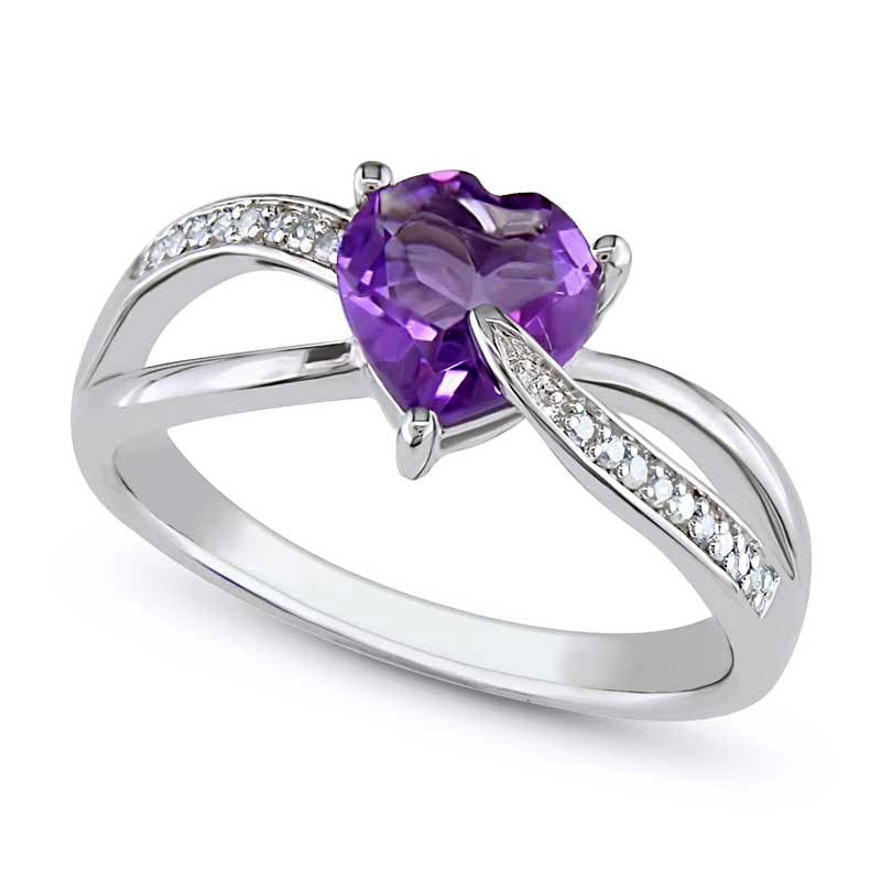 Express your love with this enchanting fashion ring. Made of sterling silver, this ring showcases a splendid 7.0mm heart-shaped amethyst center stone in a rich, luxurious purple hue. The shank of the ring features a unique crossover design adorned with sparkling 1/20 carat total weight diamonds that add a touch of glamour to the piece. Perfect for commemorating a special occasion or as a token of affection, this ring makes a thoughtful and magical gift. The ring is polished to a brilliant shine, and is custom made to fit her ring size. Please note that sterling silver rings cannot be resized after purchase.