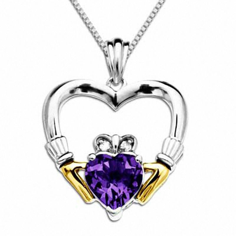 7.0mm Heart-Shaped Amethyst and Natural Diamond Accent Claddagh Heart Pendant in Sterling Silver and 14K Gold