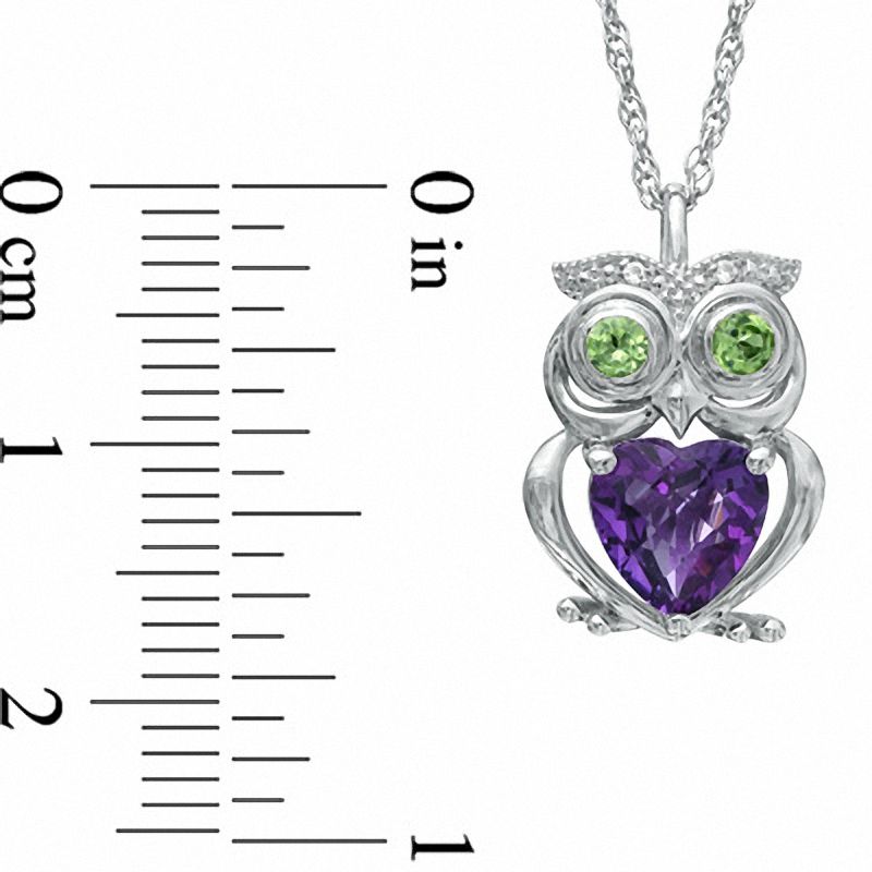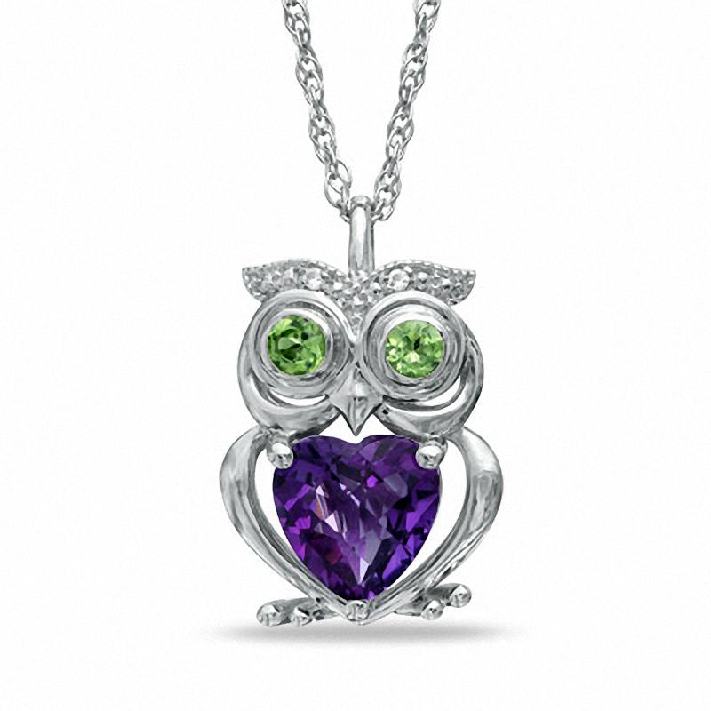 7.0mm Heart-Shaped Amethyst, Peridot and Lab-Created White Sapphire Owl Pendant in Sterling Silver