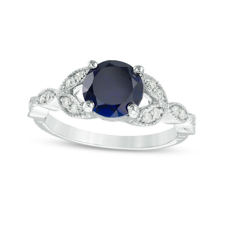 7.0mm Lab-Created Blue Sapphire and 0.17 CT. T.W. Diamond Antique Vintage-Style Petals Engagement Ring in Solid 10K White Gold