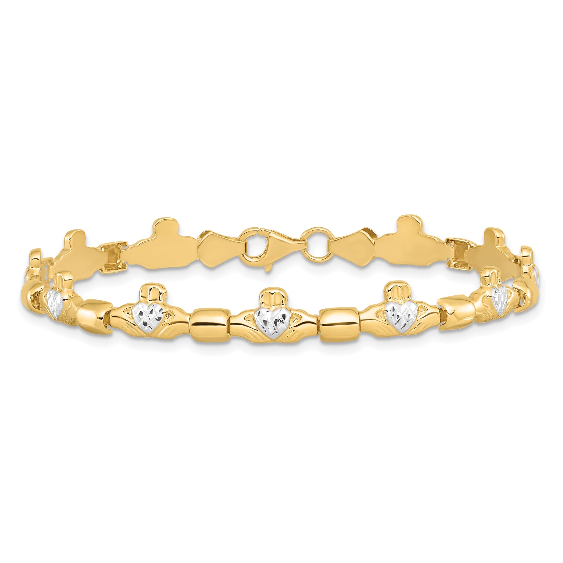The 7.25 Inch 14K with Rhodium Diamond-Cut Claddagh Polished Link Bracelet blends elegance and tradition. Crafted from 14K yellow gold, it features eye-catching rhodium plating that brings out a brilliant silver tone. The bracelet's polished shine and diamond-cut texture add a touch of sophistication. Measuring 7.25 inches long and 6 mm wide, it offers comfort and style. Its flat back makes it easy to wear, while the fancy lobster clasp ensures security. Designed with 11 distinctive elements, this bracelet sets itself apart. The 7.25 Inch 14K with Rhodium Diamond-Cut Claddagh Polished Link Bracelet is perfect for any jewelry collection.