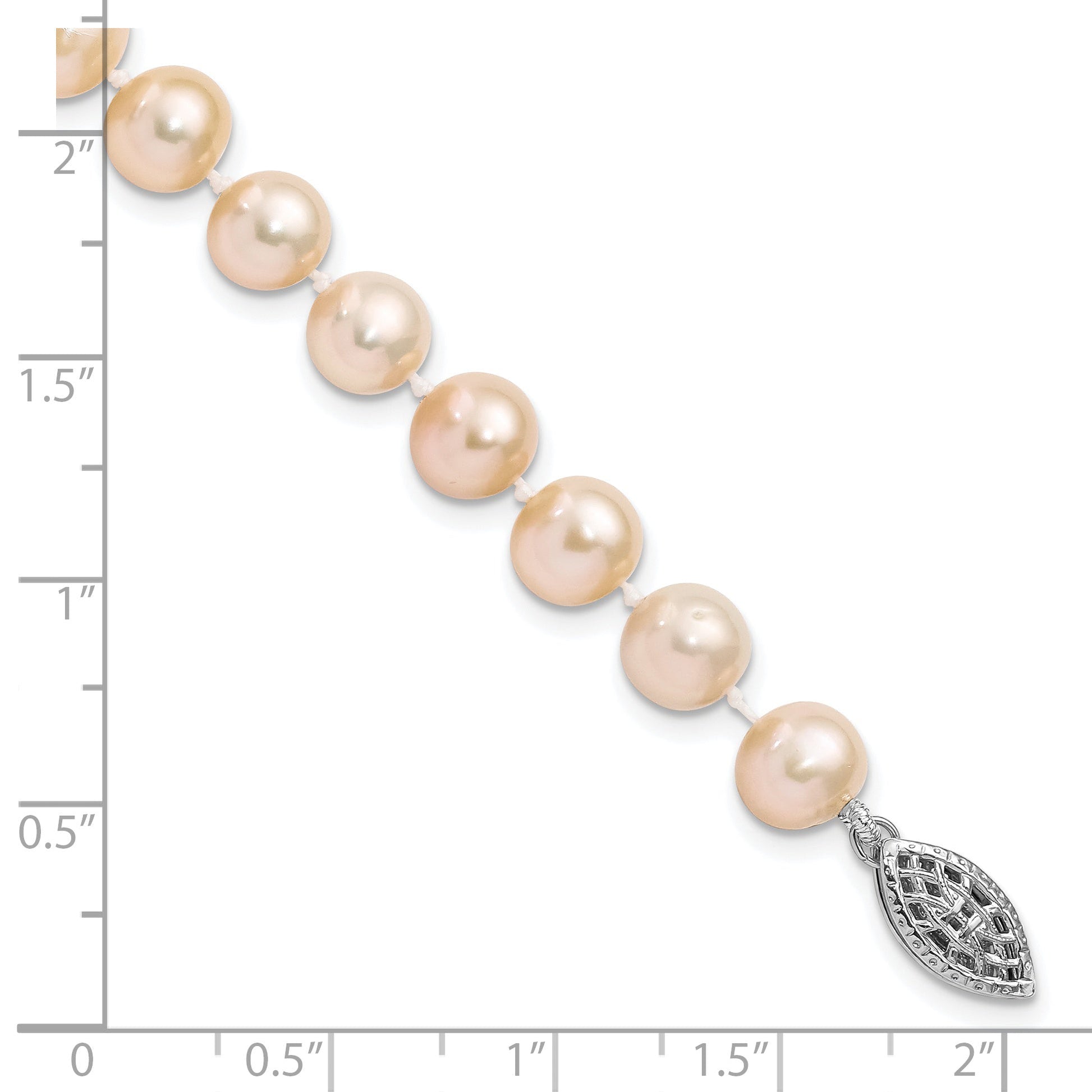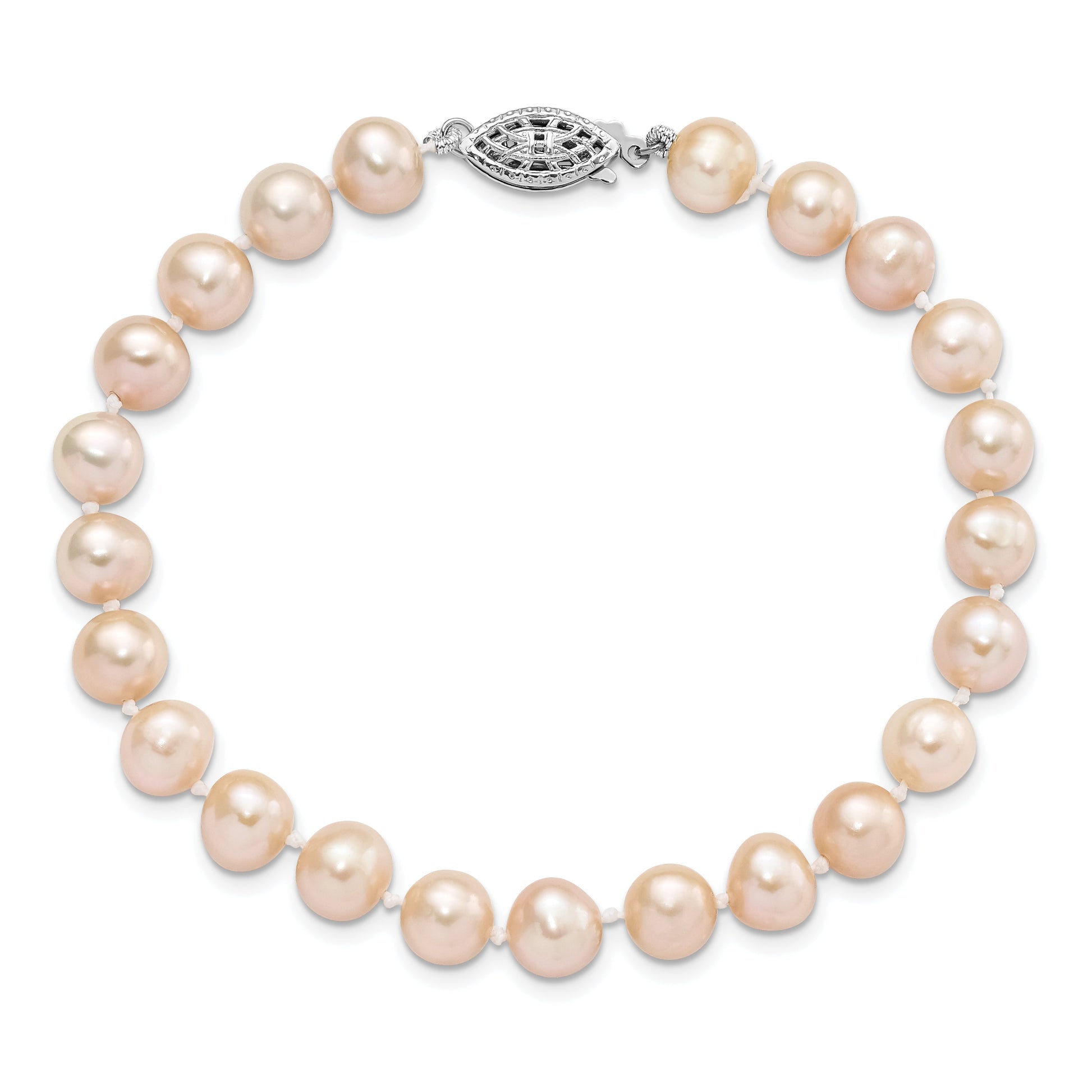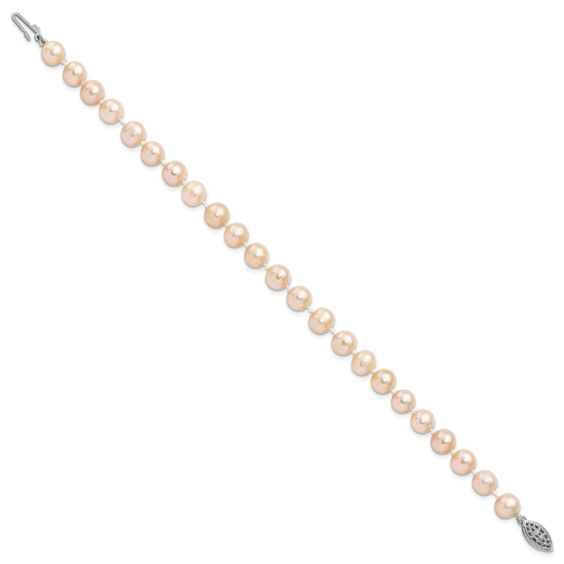 Introducing the elegant 7.25 Inch Sterling Silver Rhodium-Plated 7-8mm Pink Freshwater Pearl Bracelet. Designed in sterling silver, this polished beauty boasts a 925 purity and Rhodium plating. The bracelet features near-round cultured freshwater pearls, dyed to a delicate pink hue, ensuring each one is unique. The pearls range from 7 to 8 mm and secure with a chic pearl clasp. Crafted through a die-struck method, this stunning piece makes the perfect gift or personal statement. Add a touch of class with this remarkable 7.25 Inch Sterling Silver Rhodium-Plated Pink Pearl Bracelet.