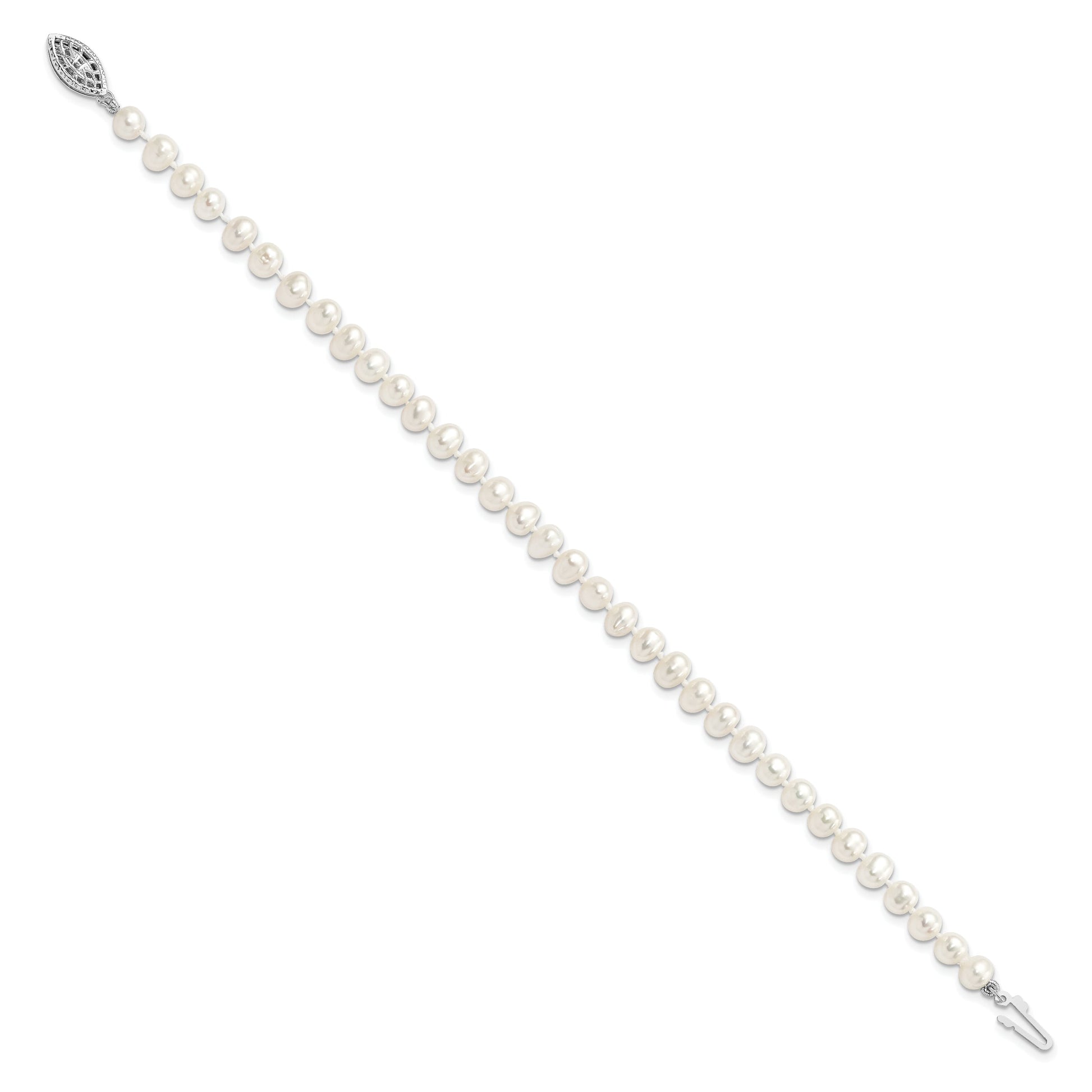 Radiate timeless elegance with this 7.25 Inch Sterling Silver Rhodium White Freshwater Cultured Pearl Bracelet. Crafted from 925 sterling silver, each gem showcases near-round, 5 to 6mm pearls that shimmer in classic white. The rhodium plating adds a touch of sophistication while enhancing the bracelet's durability and shine. Skillfully die-struck, this solid bracelet boasts a secure clasp that ensures ease of wear. Perfect for any occasion, it complements a wide range of styles. Elevate your jewelry collection with the charm and grace of this exquisite pearl bracelet.