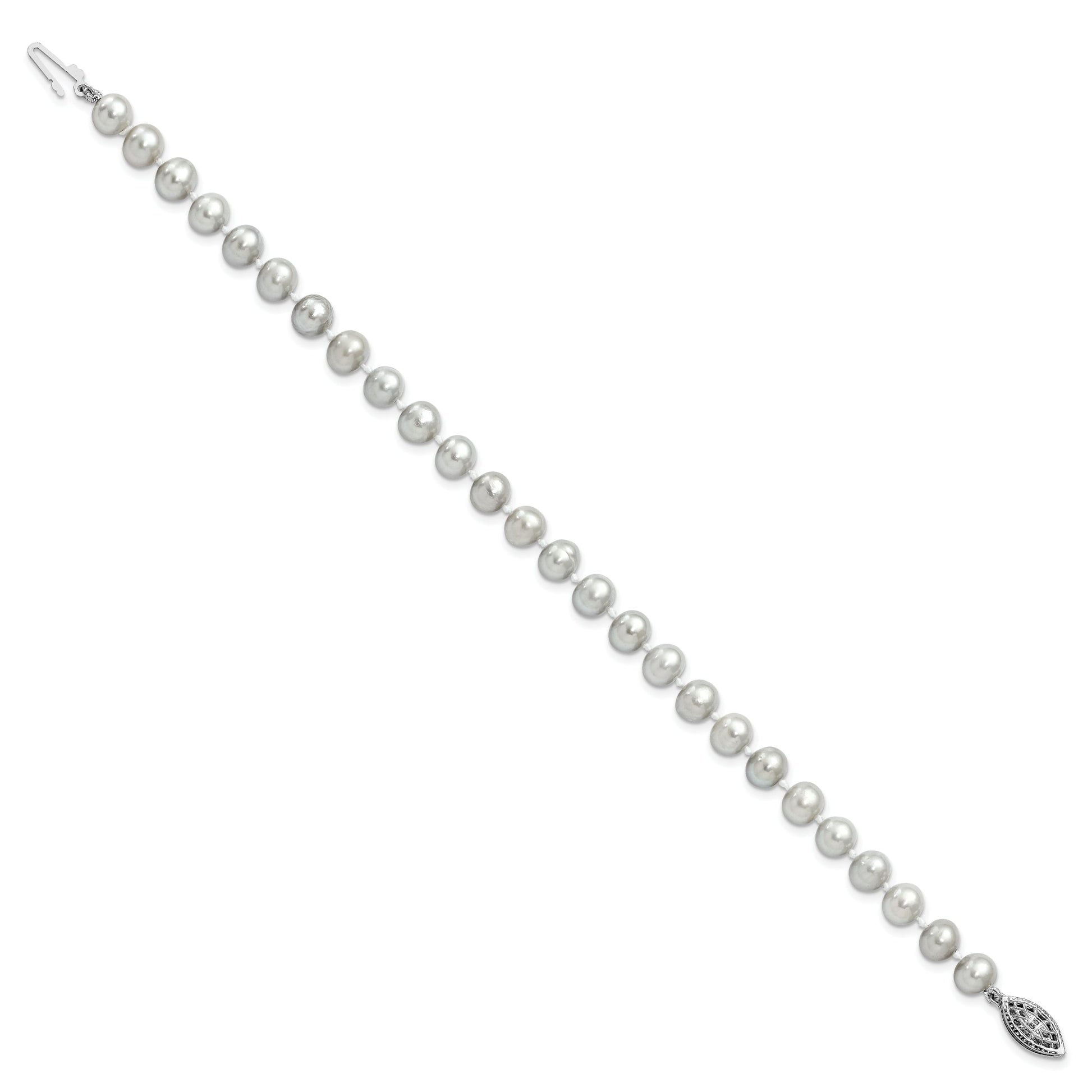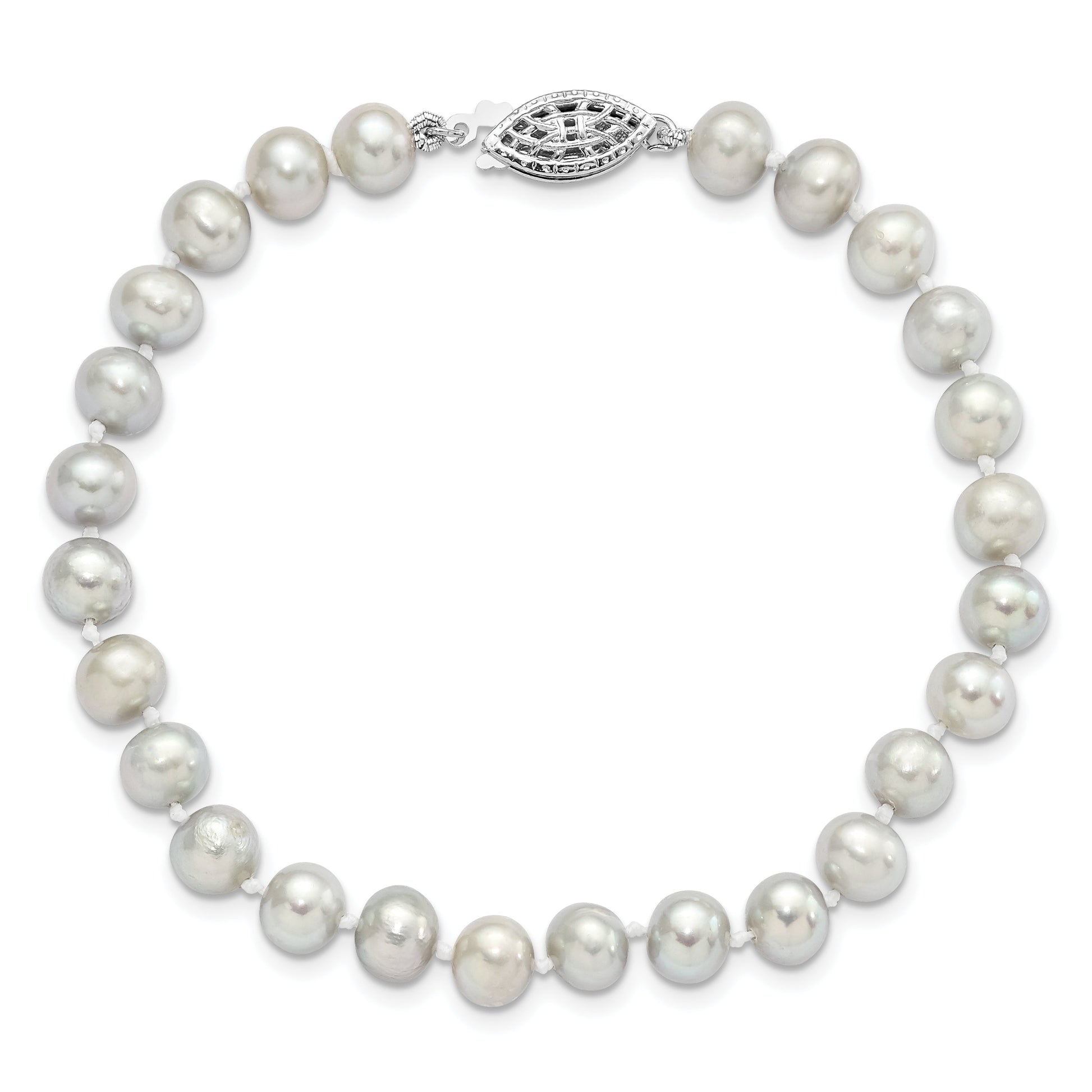 The 7.25 Inch Sterling Silver Rhodium 6-7mm Grey FWC Pearl Bracelet makes a classy addition to any jewelry collection. Crafted from high-quality 925 sterling silver, it features polished rhodium plating enhancing its gleaming sheen. The bracelet showcases cultured freshwater pearls, each 6 to 7mm in size, with an elegant near-round shape. These dyed grey pearls convey a refined aura. The bracelet's total length is a perfect 7.25 inches, secured by a stylish pearl clasp. The impeccable craftsmanship through the die-struck process ensures durability. Elevate your style with this sterling beauty.