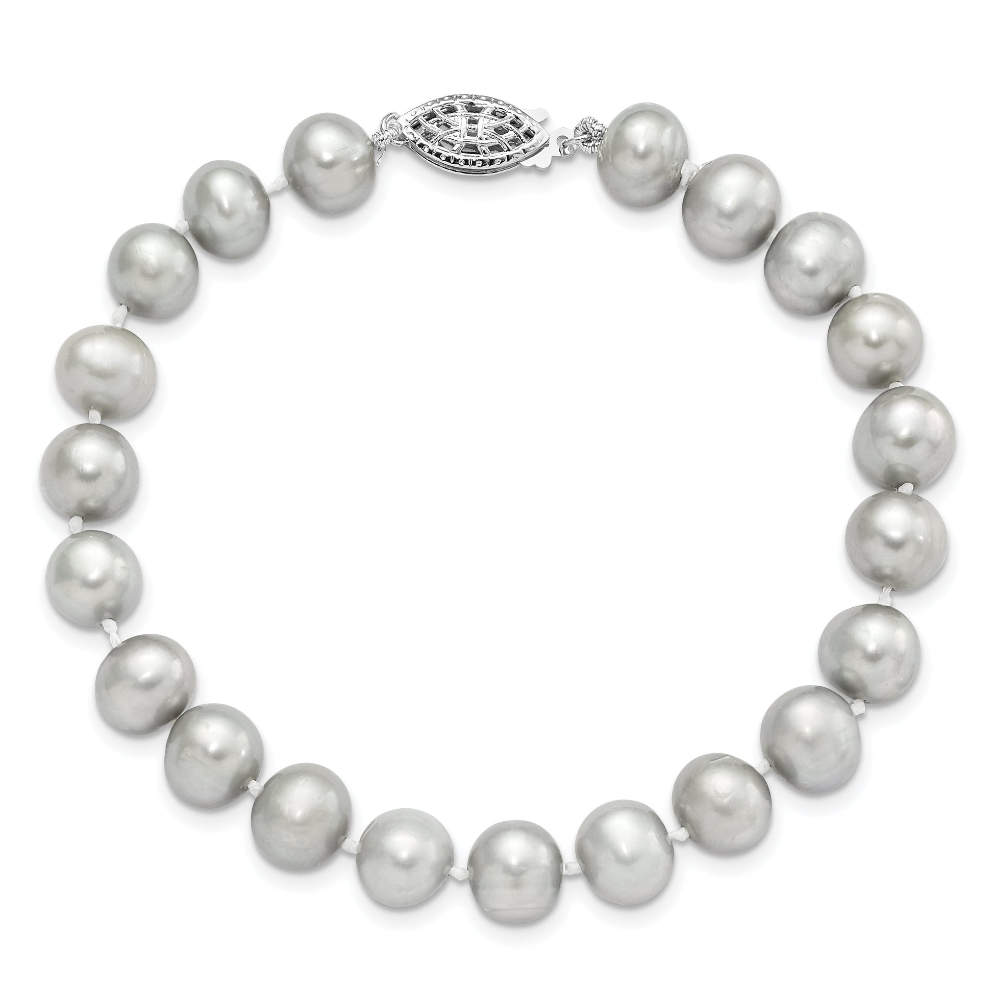 Meet elegance with this 7.25-inch Sterling Silver Rhodium Grey Freshwater Cultured Pearl Bracelet. Crafted with precision, it features 7-8mm near-round grey pearls that radiate sophistication. Set against polished sterling silver with rhodium plating, this bracelet offers a timeless appeal and a silver tone that beautifully complements its gleaming pearls. A pearl clasp ensures it stays secure on your wrist all day. Perfect for any occasion, this pearl bracelet is a must-have accessory, blending classic style and modern glam. Wear it and feel the charm every time you do.
