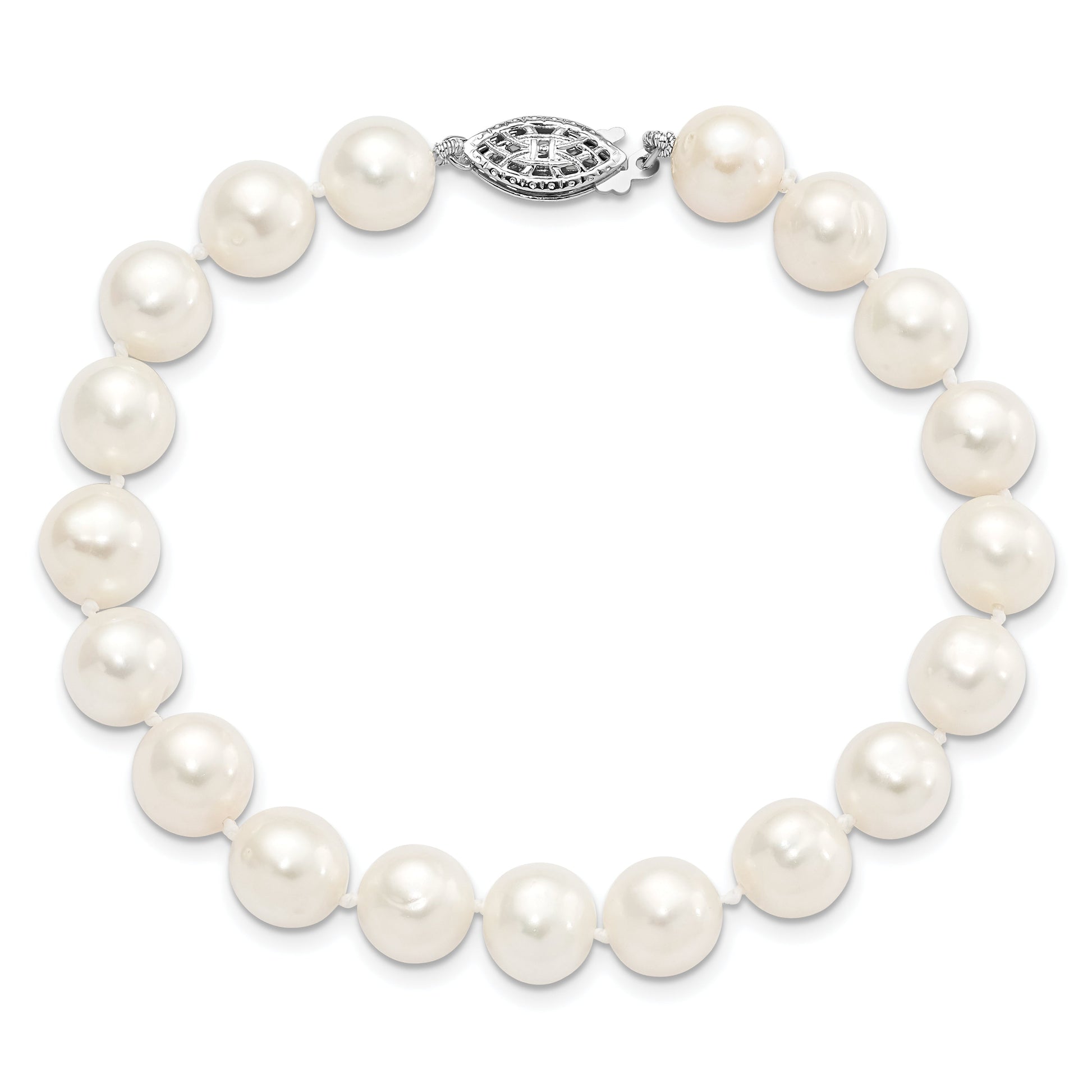 Introducing the 7.25 Inch Sterling Silver Rhodium White Freshwater Cultured Pearl Bracelet, a chic addition to any jewelry collection. Crafted from 925 sterling silver with a sleek rhodium plating, this bracelet boasts a classic design with its 9-10mm near-round cultured pearls. Each pearl shines in pristine white, offering a touch of elegance to your wrist. The bracelet, created using a die-struck process, measures 7.25 inches long and 10mm wide, ensuring a comfortable fit. Perfectly suited for any woman, this timeless piece is an exquisite blend of sophistication and style.