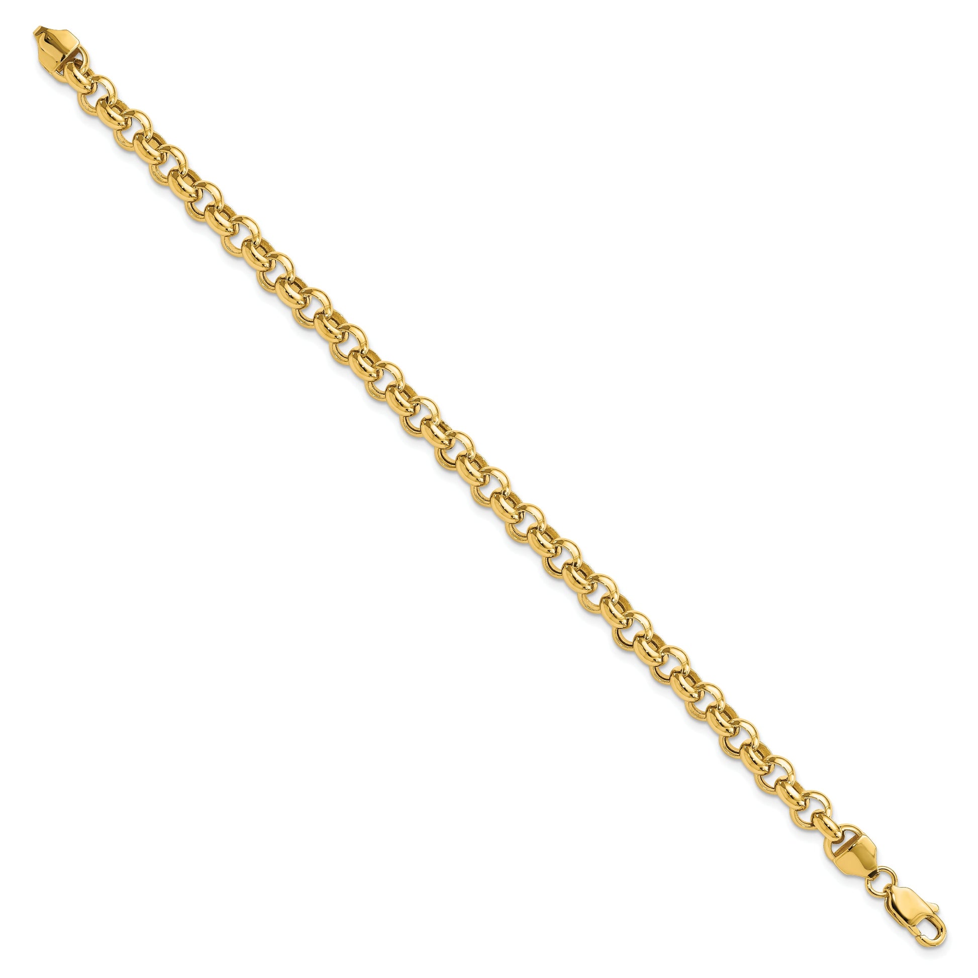 The 7.5 Inch 14K Polished Fancy Rolo Link Bracelet stands out with its gleaming design and luxurious allure. Crafted from high-quality 14K yellow gold, this 7.5-inch bracelet features polished, die-struck rolo links that offer a sleek and stylish look. Its 6.25 mm width makes it comfortable, yet eye-catching, perfect for everyday elegance or enhancing a night-out outfit. A sturdy lobster clasp ensures it stays securely on your wrist. The 7.5 Inch 14K Polished Fancy Rolo Link Bracelet adds a touch of opulence to any jewelry collection, making it an ideal choice for those who appreciate understated luxury.