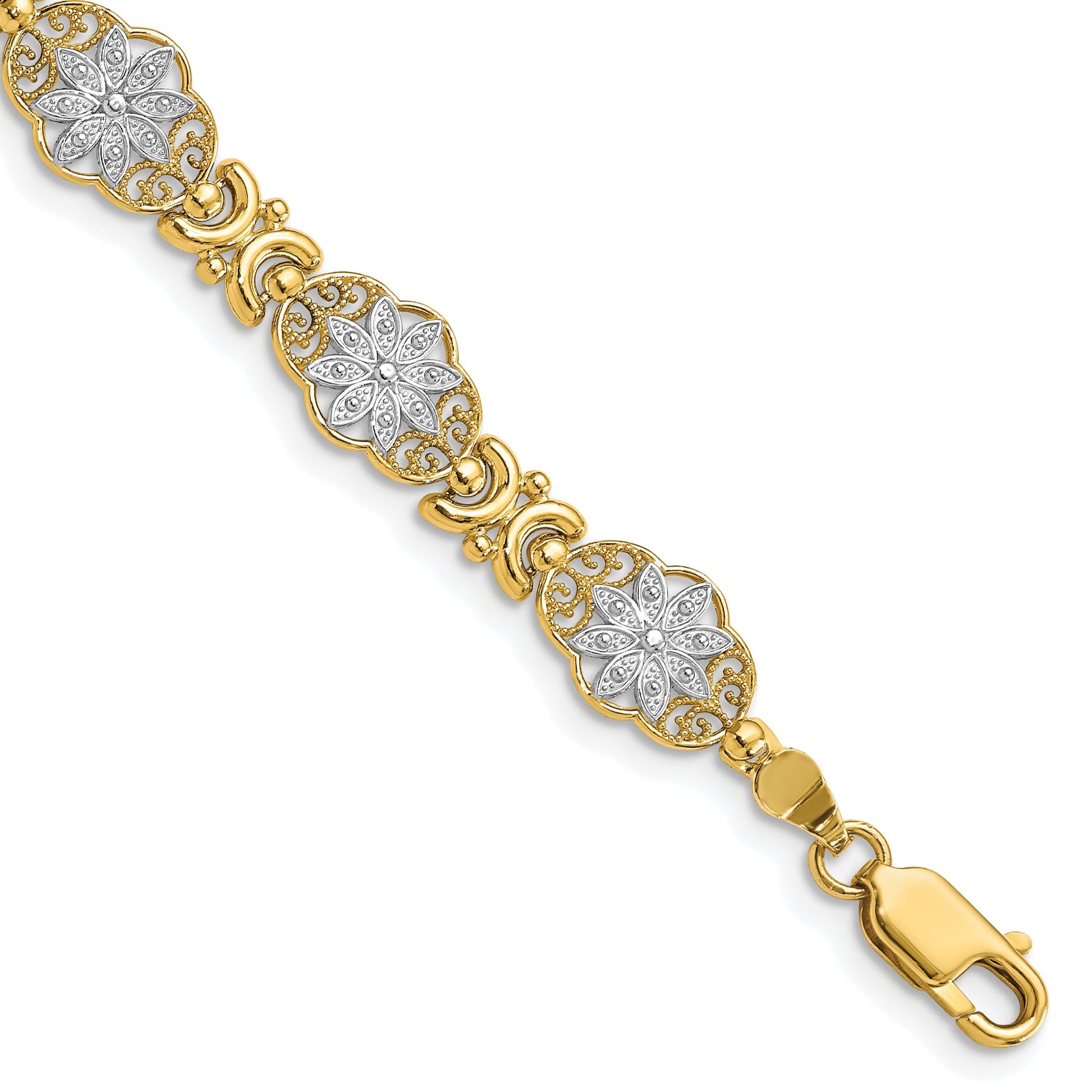Discover the timeless elegance of the 7.5 Inch 14K and White Rhodium Flower Bracelet. Crafted from lustrous 14K gold with exquisite white rhodium accents, this piece boasts a polished finish that glimmers in any light. Its 7.5-inch design includes nine intricately themed elements, each radiating charm with dimensions of 14.65 mm in length and 8.25 mm in width. The fancy chain, measuring 8.25 mm wide, adds sophistication, while the secure lobster clasp ensures a snug fit. Ideal for any occasion, the 7.5 Inch 14K and White Rhodium Flower Bracelet is a must-have masterpiece.