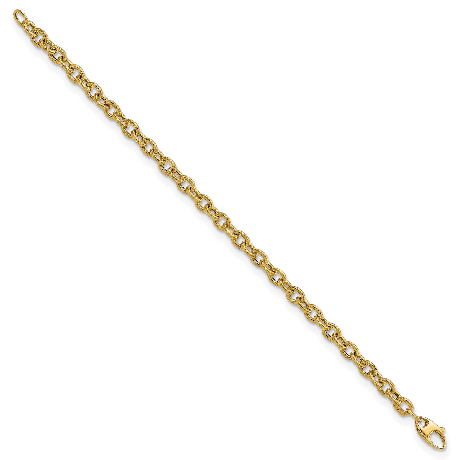 Discover elegance with the 7.5 Inch 14K Polished and Textured Cable Link Bracelet. Crafted from pure 14K yellow gold, this bracelet combines polished and textured finishes for a striking look. The cable design adds a classic touch, while its 7.5-inch length ensures a comfortable fit. A fancy lobster clasp secures the bracelet, adding a touch of sophistication. The clasp's design guarantees secure wear while adding a decorative element to the piece. Embrace a timeless style with the 7.5 Inch 14K Polished and Textured Cable Link Bracelet, a perfect companion for both casual and formal outfits.