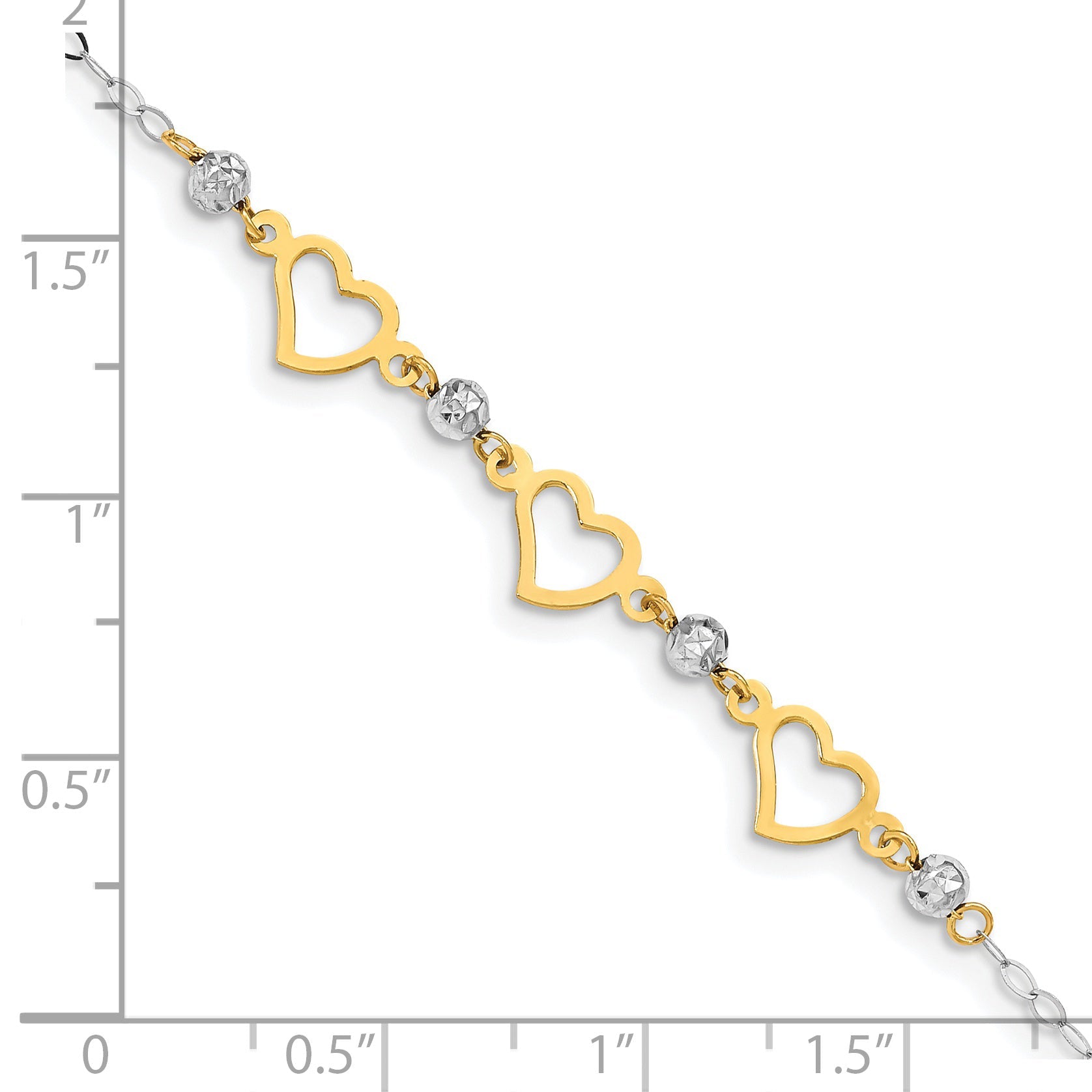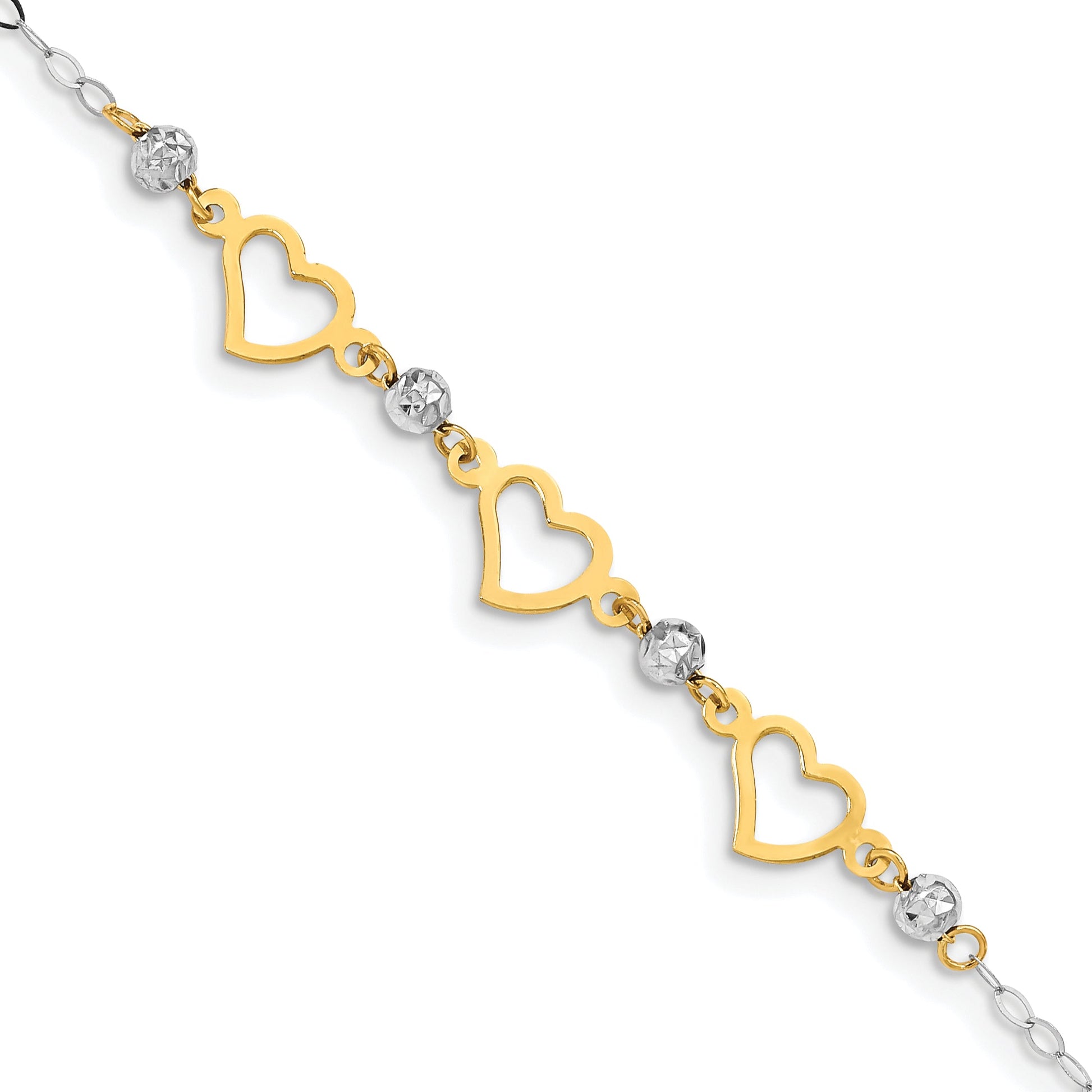 Introducing our stunning 7.5 Inch 14K Two-Tone Oval Link Diamond Cut Beads and Heart Bracelet, crafted to perfection. This polished beauty features a mix of yellow and white gold, creating a striking two-tone effect. Each diamond-cut bead and heart detail adds a touch of sparkle, making it a standout piece. The bracelet measures 7.5 inches in length and 6 mm in width, secured with a spring ring clasp for a snug fit. Machine-made for durability, this 14K gold bracelet is a solid addition to any jewelry collection. Elevate your elegance with this exquisite 7.5 Inch 14K Two-Tone Oval Link Diamond Cut Beads and Heart Bracelet.
