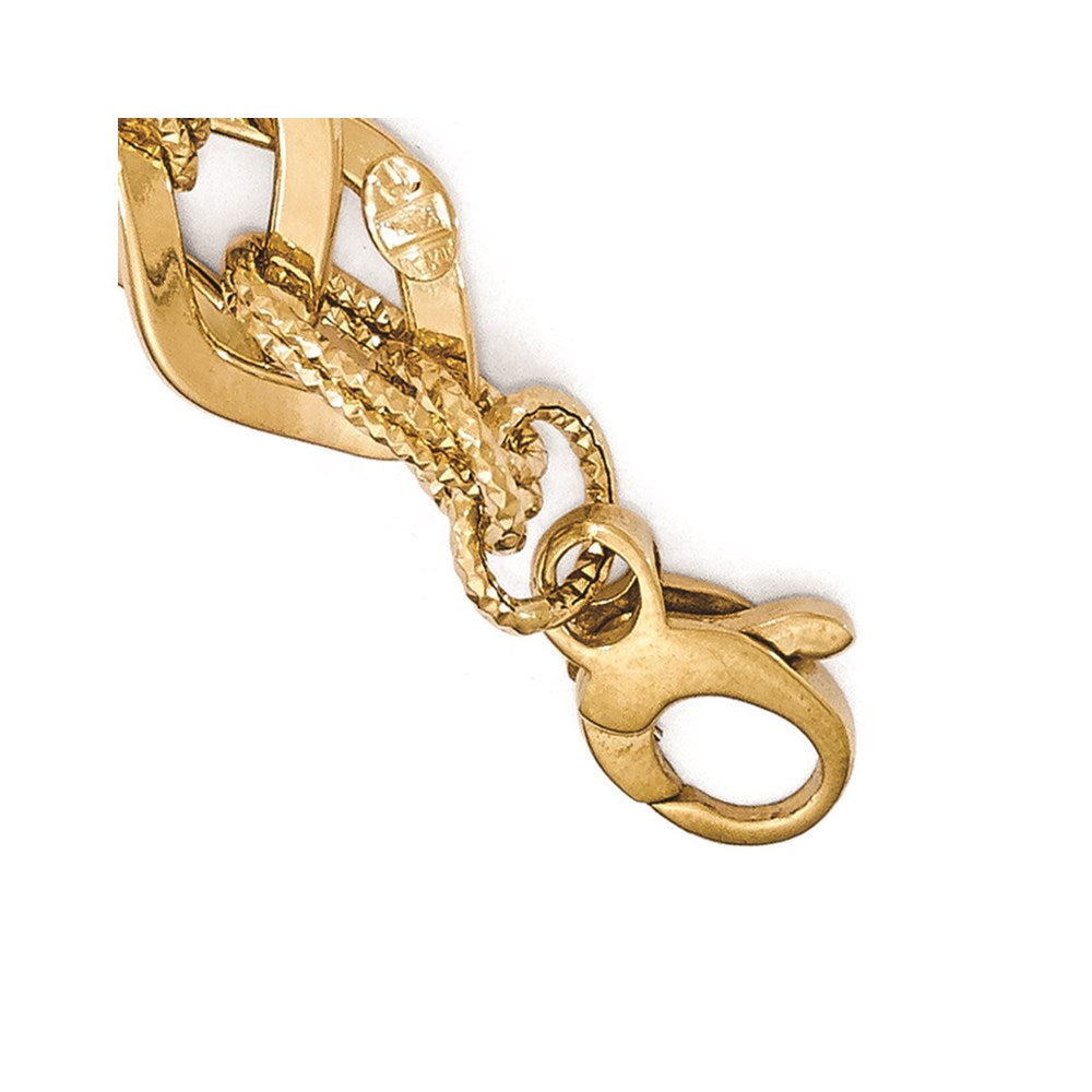 Discover elegance with the 7.5 Inch 14K Yellow and White Gold Polished D/C Bracelet. This bracelet blends sophistication with style, boasting a lustrous two-tone design. Made from fine 14K gold, it features a captivating diamond-cut texture that catches the light beautifully. The bracelet's 12mm width makes a bold statement, while its polished finish exudes luxury. Equipped with a fancy lobster clasp, it offers both beauty and security. Complete your look with the 7.5 Inch 14K Yellow and White Gold Polished D/C Bracelet and enjoy its timeless appeal.
