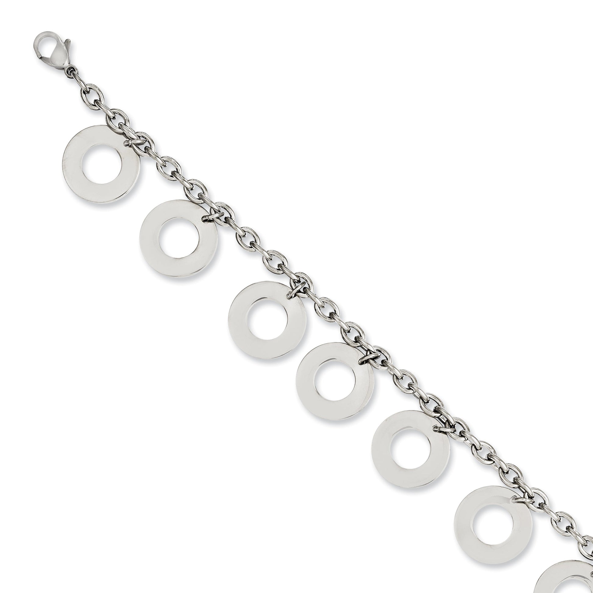 Discover the charm of our 7.5 Inch Stainless Steel Polished Dangle Circles Bracelet. Crafted in sleek stainless steel, this bracelet boasts a polished finish that gleams with every movement. At 7.5 inches in length with a 5 mm chain width, it sits comfortably on your wrist, making it perfect for daily wear or special occasions. Each piece features an easy-to-use lobster clasp for secure closure. The white hue adds a touch of elegance, making it an ideal accessory for any outfit. Elevate your style with this exquisite bracelet today.