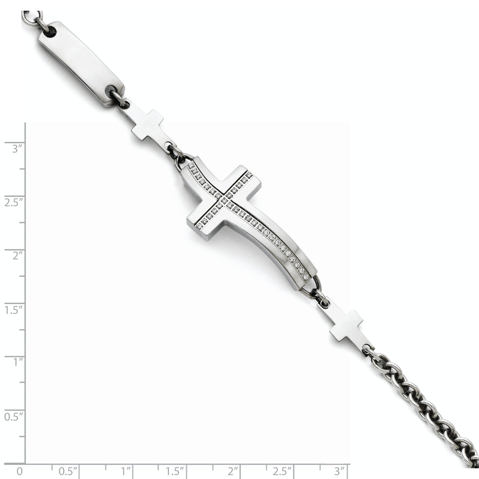 Introducing the 7.5 Inch Stainless Steel Polished Wavy Cz Sideways Cross Bracelet. This elegant piece showcases a beautiful sideways cross adorned with 33 sparkling round cubic zirconia stones, each set in polished stainless steel for a bright finish. The bracelet runs 7.5 inches in length, with a 4 mm chain width, ensuring a comfy yet secure fit with a lobster clasp closure. Its chic wavy design and clear stones offer a perfect combination of modern style and timeless grace. Treat yourself or a loved one to the magnificent 7.5 Inch Stainless Steel Polished Wavy Cz Sideways Cross Bracelet.