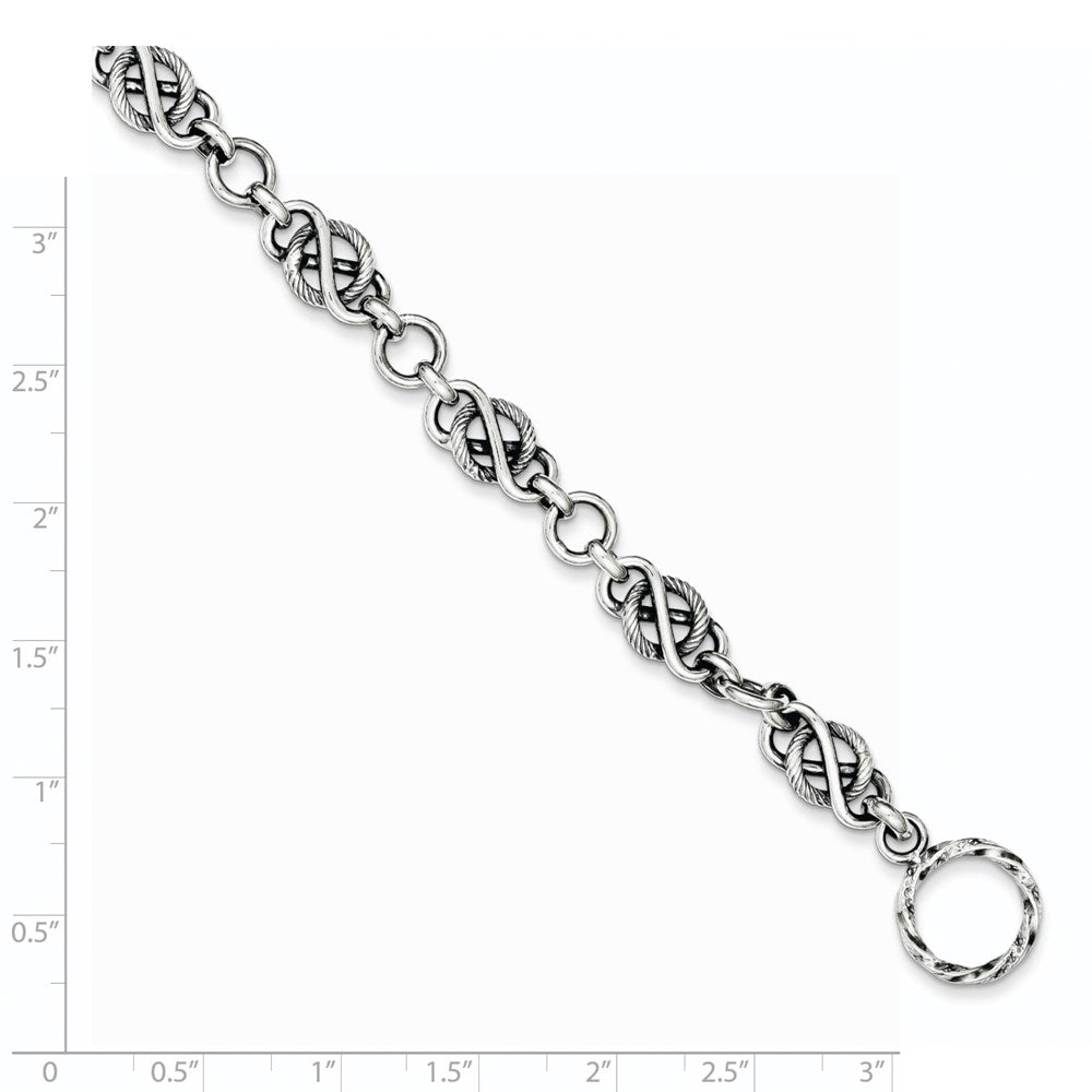 Introducing a stunning piece of artistry, the 7.5 Inch Sterling Silver Antiqued Fancy Link Bracelet. This handcrafted bracelet combines the elegance of polished sterling silver with an antiqued finish for a vintage charm. At 8mm wide, the fancy link chain offers a touch of sophistication with its unique design. The sturdy toggle clasp ensures both style and security. Measuring 7.5 inches, it's a perfect fit for your wrist, adding a classic yet modern touch. Embrace timeless style with the 7.5 Inch Sterling Silver Antiqued Fancy Link Bracelet, making every gesture graceful.