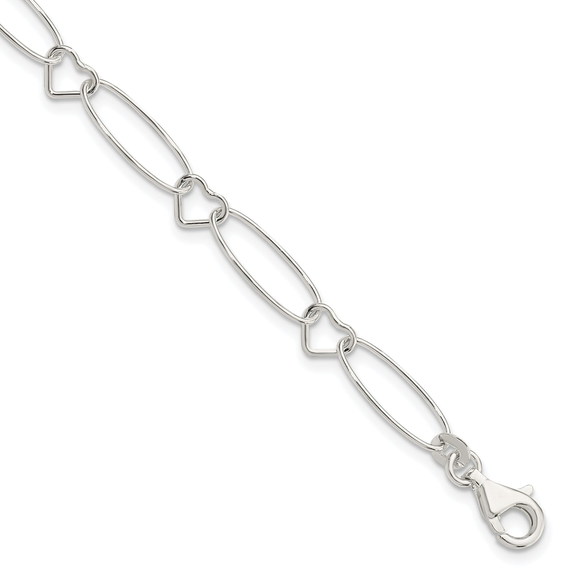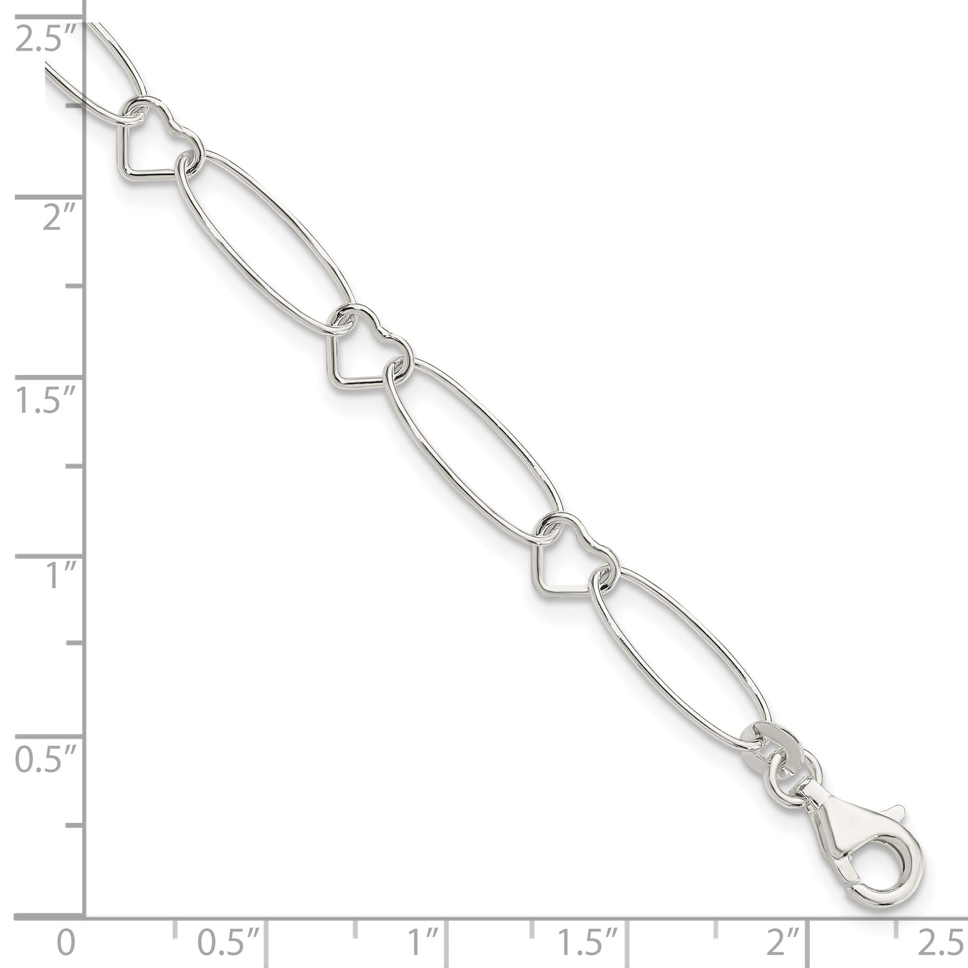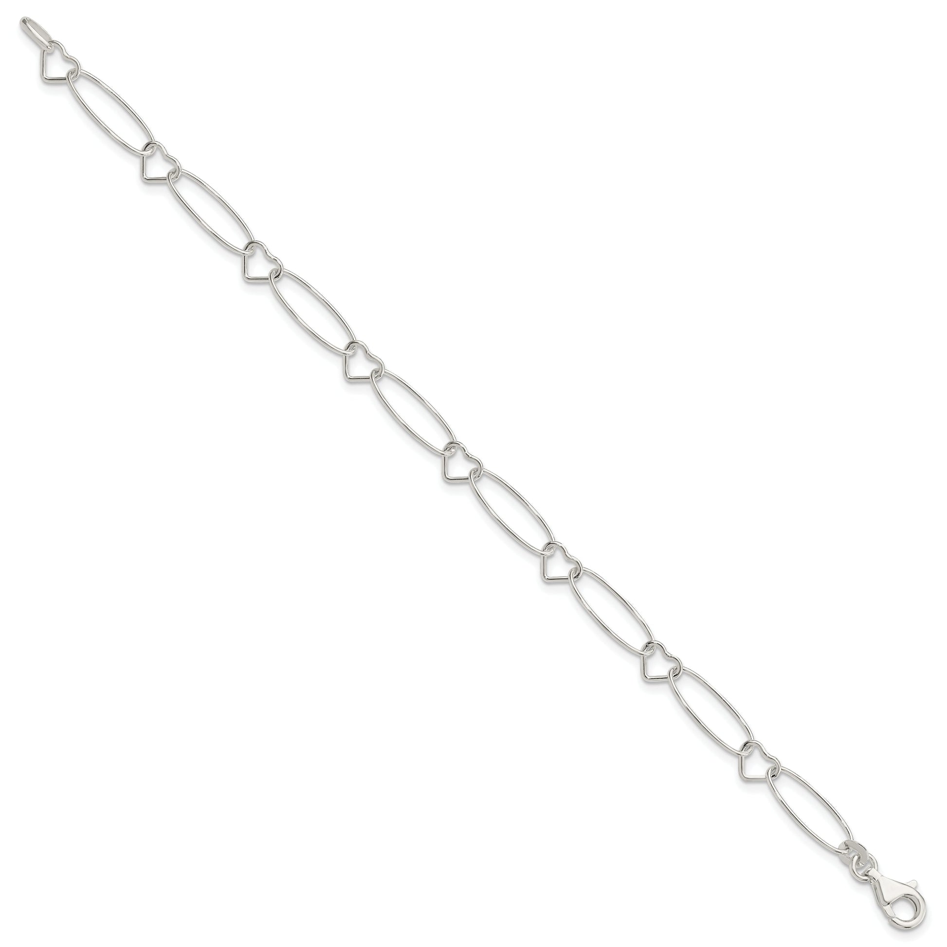Capture elegance with our 7.5 Inch Sterling Silver Oval Link with Hearts Bracelet. Designed from high-quality 925 sterling silver, this bracelet shines with a polished finish, giving your wrist a sophisticated edge. Its unique chain features oval links intertwined with heart motifs, adding a touch of romance to your everyday style. Measuring 7.5 inches long and 7mm wide, this bracelet offers a comfortable fit. Secured with a fancy lobster clasp, it's both stylish and practical. The 7.5 Inch Sterling Silver Oval Link with Hearts Bracelet is a timeless piece that complements any jewelry collection.
