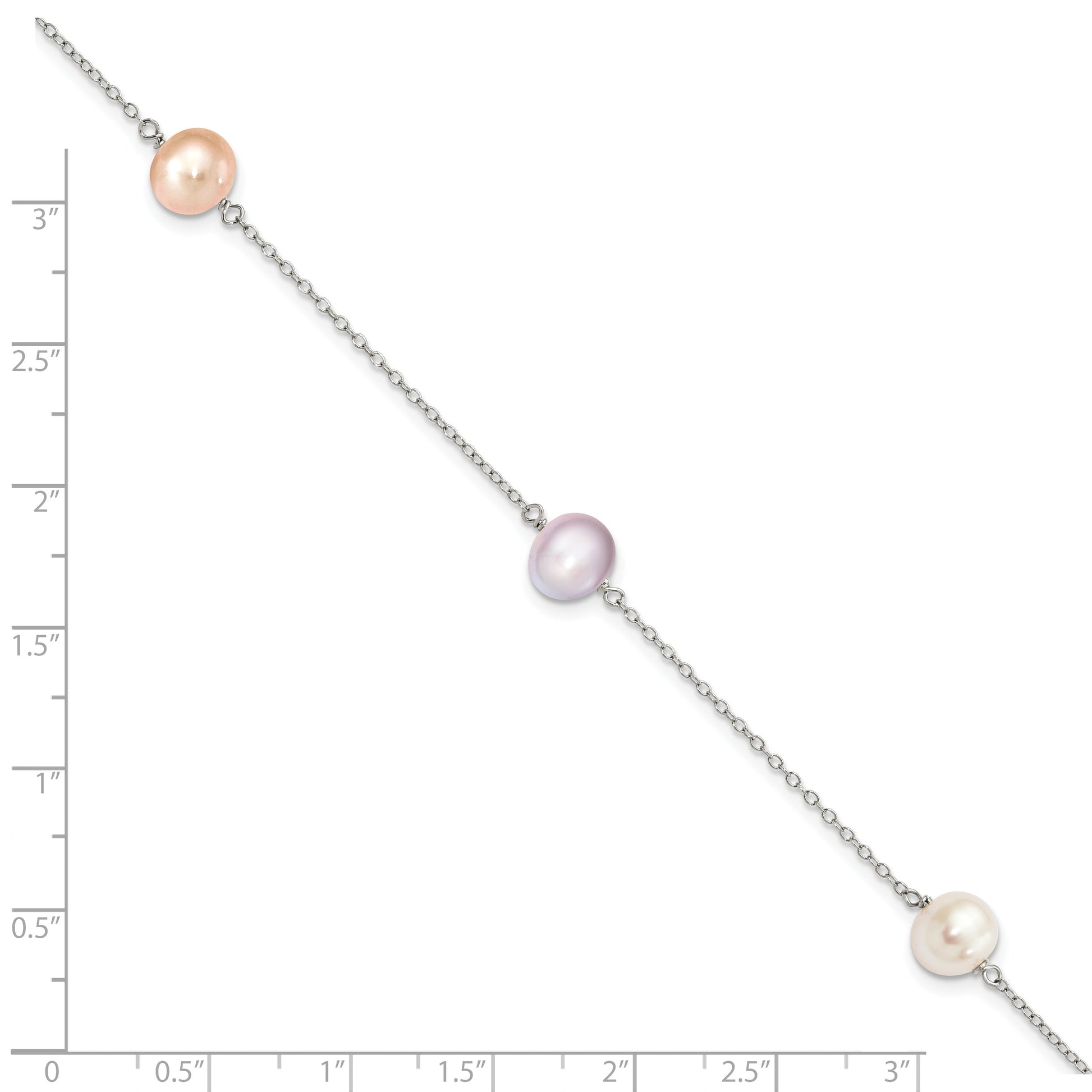 The 7.5 Inch Sterling Silver Rh-P 3-Stat 7-8M White, Pink, and Purple Semi-Round Freshwater Cultured Pearl Bracelet is a true gem. Crafted from polished 925 sterling silver, it features three stunning semi-round pearls elegantly dyed in white, pink, and purple hues. Each pearl, ranging from 7 to 8mm, shines against the rhodium-plated chain. The bracelet is 7.5 inches long, with a charming 1.2mm wide chain, and secures with a reliable spring ring clasp. Ideal for women, this sparkling piece is both timeless and chic. Add a touch of elegance with this sterling silver pearl bracelet.