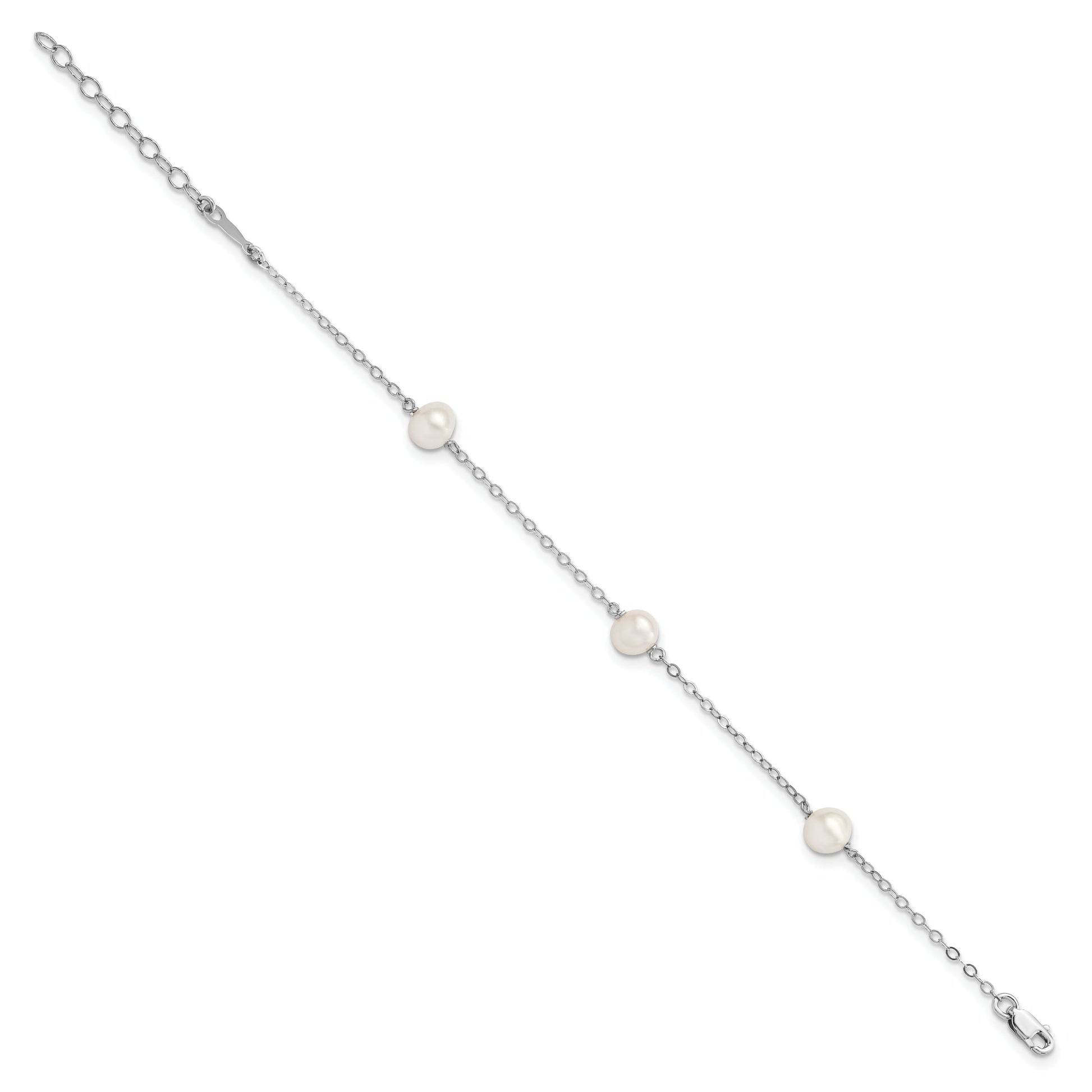 Elevate your style with the 7.5 Inch Sterling Silver Rh-Plated Freshwater Cultured Pearl Bracelet. Crafted from high-quality 925 sterling silver with rhodium plating, this elegant piece boasts five near-round freshwater pearls. The subtle white hue of the 5-6mm pearls exudes timeless charm, while the polished finish adds a sleek touch. A secure lobster clasp ensures this bracelet remains a staple in your accessory collection. Whether you're dressing up for a special evening or adding flair to your day, the 7.5 Inch Sterling Silver Freshwater Pearl Bracelet complements your look flawlessly.