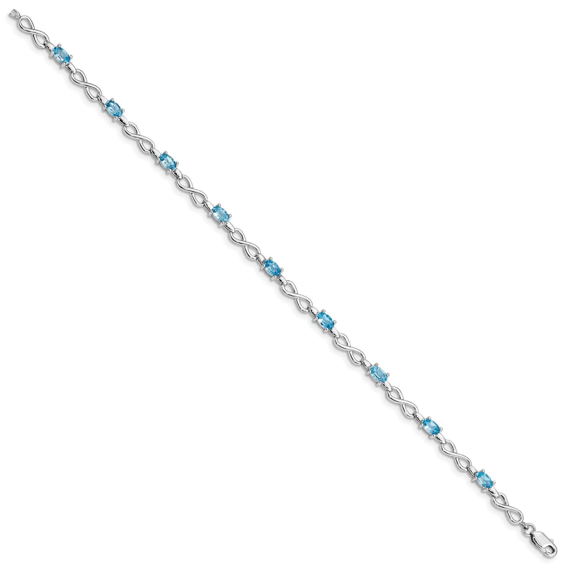The 7.5-Inch Sterling Silver Rhodium-Plated Blue Topaz Bracelet is a blend of elegance and charm. Crafted from 925 sterling silver, this bracelet dazzles with nine prong-set Swiss blue topaz stones. The vivid blue gems, each measuring 5x3 mm, add a pop of color, accentuated by a polished rhodium finish. Each stone weighs a total of 2.448 carats, ensuring a standout look. The bracelet features a lobster clasp for a secure fit and is cast with solid workmanship. Designed for women, it promises a flawless addition to any jewelry collection, elevating both casual and formal ensembles.